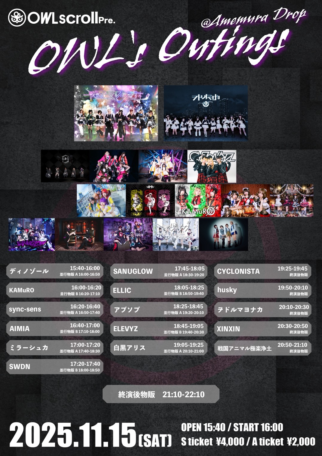 アメリカ村 DROP(ドロップ) スケジュール 2025.11.15(Sat) OWLscroll レーベル主催東名阪ツアー『OWL's Outings』 [ACT] 戦国アニマル極楽浄土/ヲドルマヨナカ/husky/XINXIN/sync-sens/ディノゾール/アブソプ/ミラーシュカ/SANUGLOW/KAMuRO/ELLIC/AIMIA/白黒アリス/SWDN/CYCLONISTA/ELEVYZ [OPEN/START] 15:20/15:40 [料金] 前方エリア¥4,000 / 一般 ¥2,000 / 当日 ¥2,500(入場時別途1D代金¥700-必要) (問)アメリカ村DROP 06-6213-9101