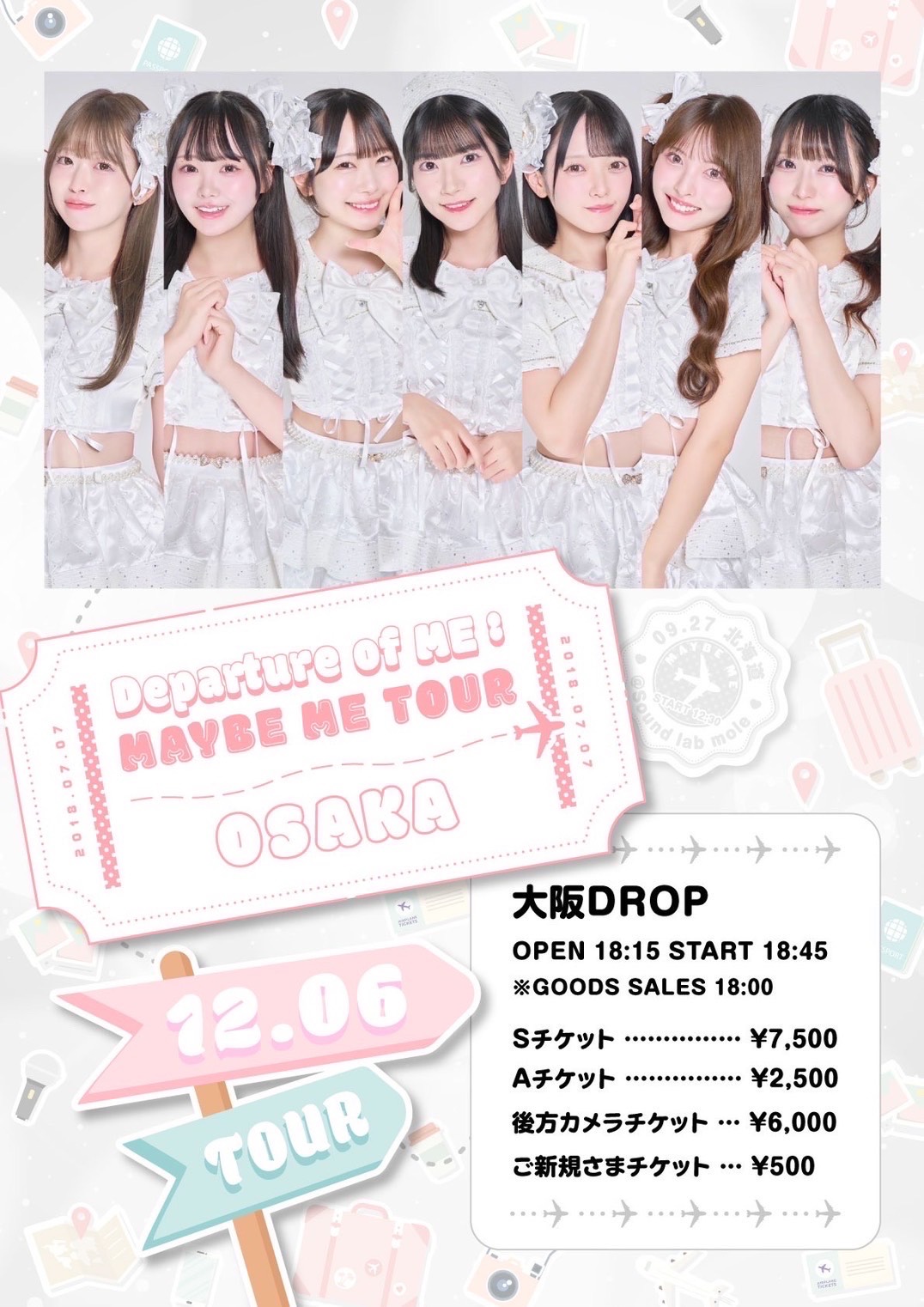アメリカ村 DROP(ドロップ) スケジュール 2025.12.06(Sat) MAYBE ME TOUR [ACT] メイビーME [OPEN/START] 18:15/18:45 [料金] 料金 Sチケット¥7,500(抽選) 後方カメラチケット¥6,000(抽選) Aチケット¥2,500 ご新規様チケット ¥500 ■チケット t-dv.com/METOUR1206