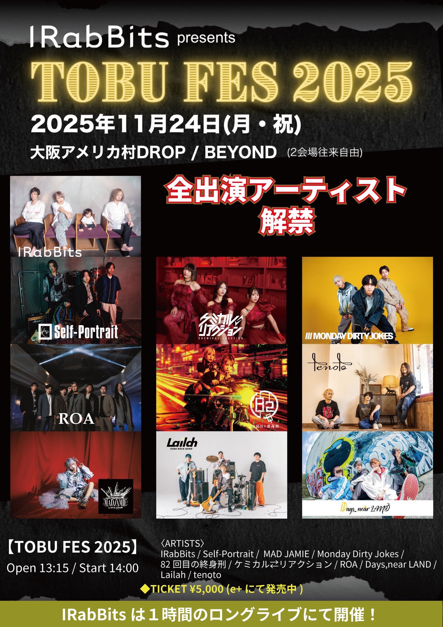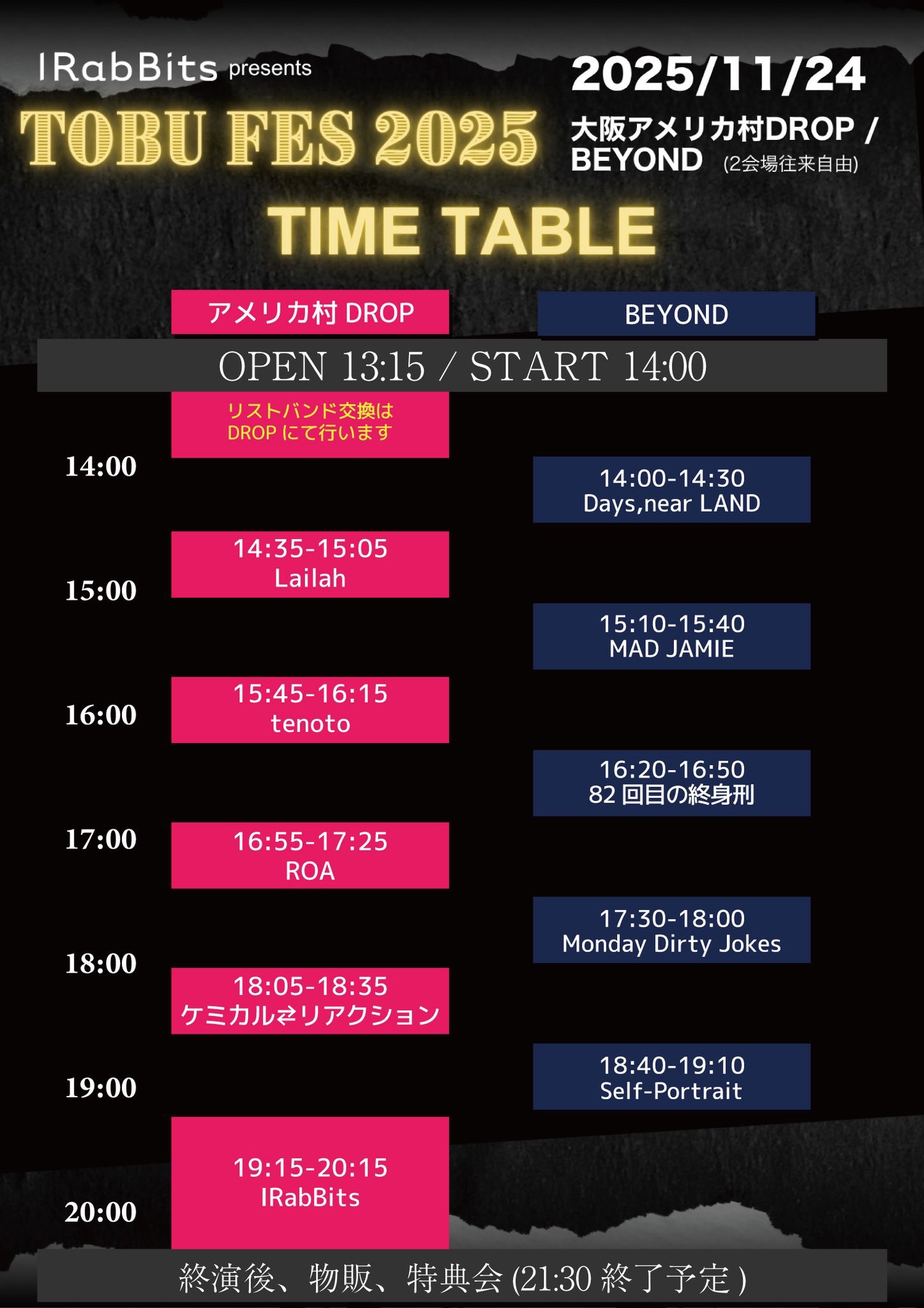 アメリカ村 DROP(ドロップ) スケジュール 2025.11.24(Mon) TOBU FES 2025 [ACT] IRabBits / Self-Portrait / MAD JAMIE / Monday Dirty Jokes / 82回目の終身刑 / ケミカル⇄リアクション / ROA / Lailah / Days,near LAND / tenoto [OPEN/START] 13:15/14:00 [料金] ADV/DOOR ¥5,000/¥--(別途1Drink代金¥700-必要) (問)アメリカ村DROP 06-6213-9101