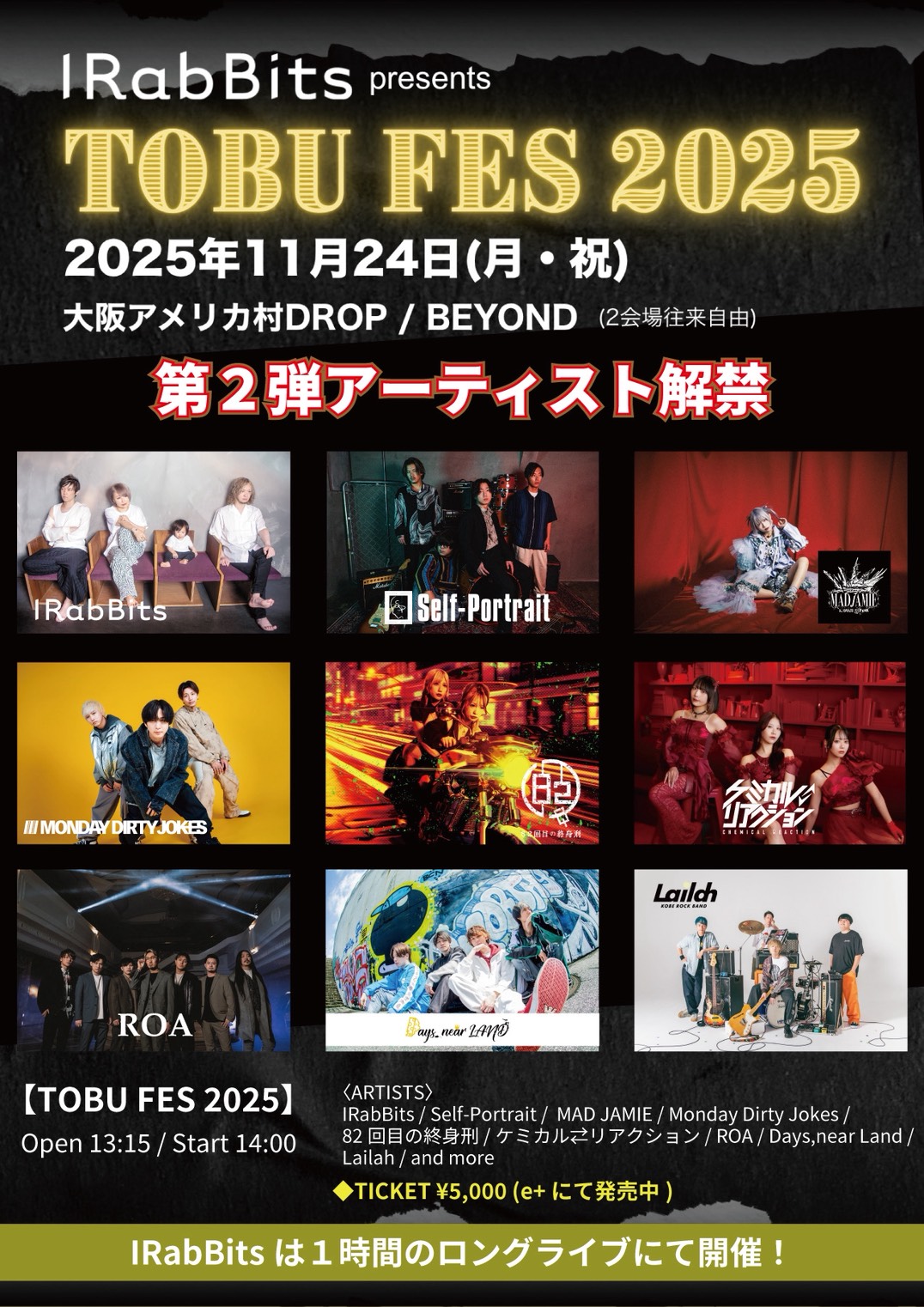 アメリカ村 DROP(ドロップ) スケジュール 2025.11.24(Mon) TOBU FES 2025 [ACT] IRabBits / Self-Portrait / MAD JAMIE / Monday Dirty Jokes / 82回目の終身刑 / ケミカル⇄リアクション / ROA / Lailah / Days,near LAND / and more [OPEN/START] 13:15/14:00 [料金] ADV/DOOR ¥5,000/¥--(別途1Drink代金¥700-必要) (問)アメリカ村DROP 06-6213-9101