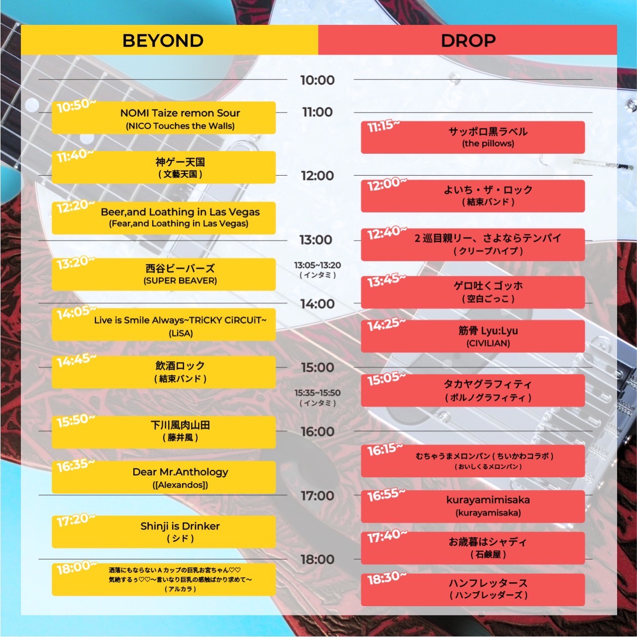 アメリカ村 DROP(ドロップ) スケジュール 2026.3.28(Sat) U69 LIVE CIRCUIT. ~LIFE IS SHORT BUY THE GUITAR~ [ACT] サッポロ黒ラベル / よいち・ザ・ロック / 2巡目親リー、さよならテンパイ / ゲロ吐くゴッホ / 筋骨Lyu:Lyu / タカヤグラフィティ / むちゃうまメロンパン(ちいかわコラボ)/ kurayamimisaka / お歳暮はシャディ / ハンフレッタース [OPEN/START] 10:40/11:15 [料金] 無料(別途2drink代¥1,400必要) (問)アメリカ村DROP 06-6213-9101