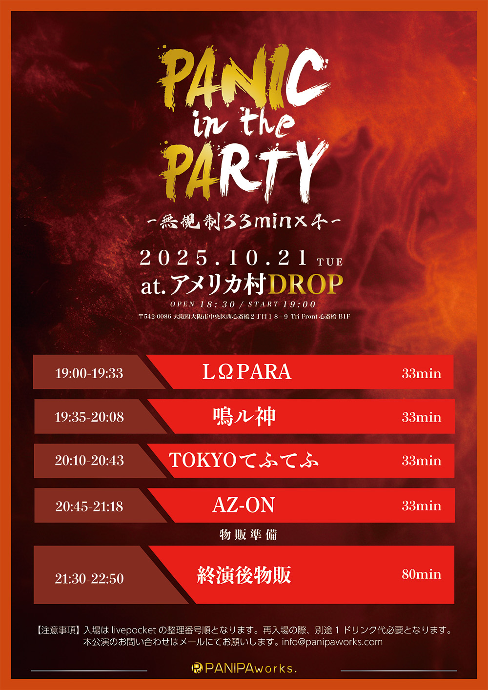 アメリカ村 DROP(ドロップ) スケジュール 2025.10.21(Tue) PANIC in the PARTY-無規制33min×4- [ACT] AZ-ON / 鳴ル神 / LΩPARA / TOKYOてふてふ [OPEN/START] 18:30/19:00 [料金] 前売り ¥1500 / 当日 ¥2000 ※入場の際、別途1ドリンク代必要 URL:https://t.livepocket.jp/e/panicintheparty-1021-