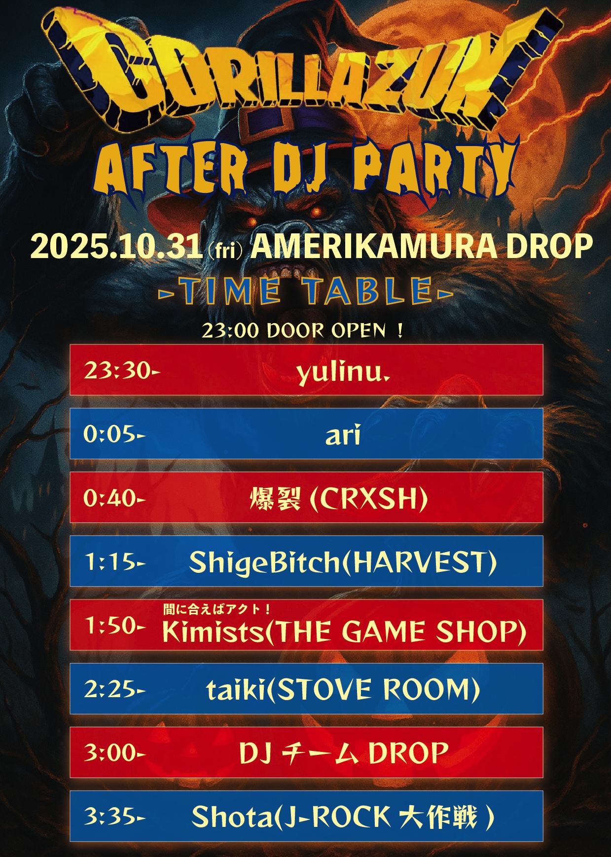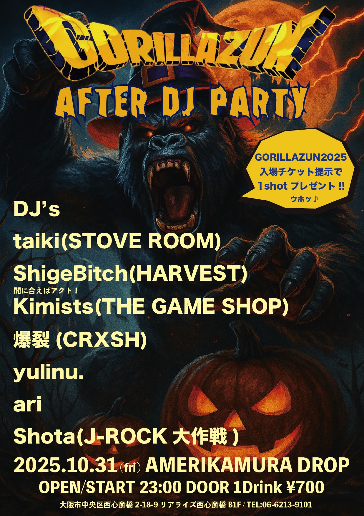 アメリカ村 DROP(ドロップ) スケジュール 2025.10.31(Fri) GORILLAZUN2025 AFTER DJ PARTY [ACT] taiki(STOVE ROOM) / ShigeBitch(HARVEST) / 爆裂(CRXSH) / yulinu. / ari / Kimists(THE GAME SHOP) / Shota(J-ROCK大作戦) [OPEN/START] 23:00 [料金] DOOR FREE 入場時別途1D代金¥700-必要 (問)アメリカ村DROP 06-6213-9101