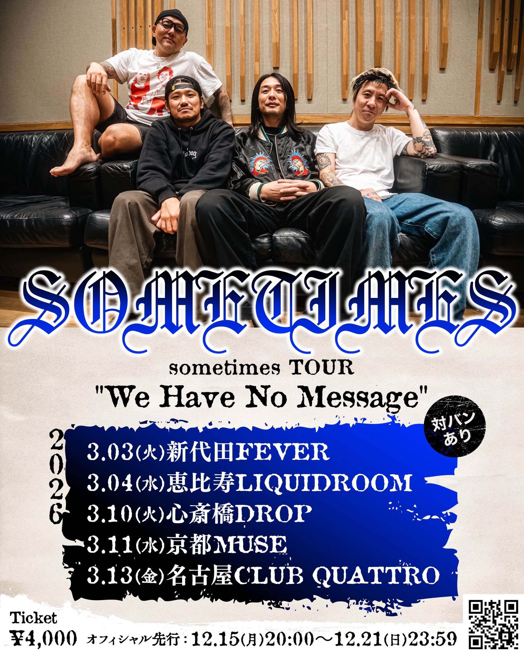 アメリカ村 DROP(ドロップ) スケジュール 2026.3.10(Tue) sometimes TOUR "We Have No Message" [ACT] sometimes [OPEN/START] 18:00/18:30 [料金] ADV/DOOR ¥4,000/¥--(入場時別途1D代金¥700-必要) 未就学児入場可能/6歳以上は有料。 券種については、紙チケットと電子チケット選択可能。1申し込み2枚まで。 主催/企画:sometimes 制作:Friedrice Inc, (問)アメリカ村DROP 06-6213-9101