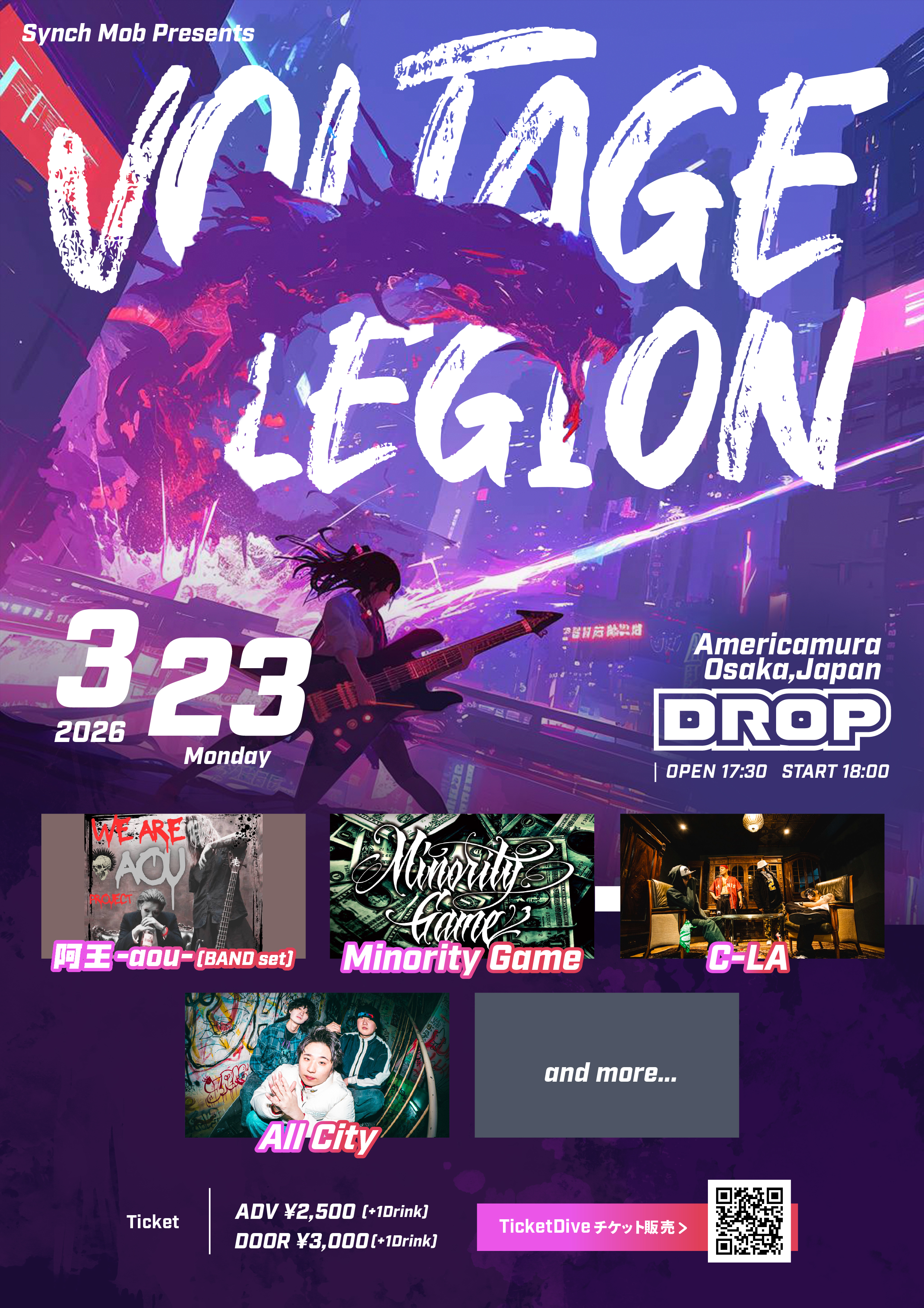 アメリカ村 DROP(ドロップ) スケジュール 2026.3.23(Mon) Synch Mob Presents "VOLTAGE LEGION " [ACT] 阿王〜aou〜(BAND Set) / Minority Game / C-LA / All City andmore!! [OPEN/START] 17:30/18:00 [料金] ADV/DOOR ¥2,500/¥3,000(入場時別途1D代金¥700-必要) ▼チケット発券 https://t-dv.com/voltagelegion0323 (問)アメリカ村DROP 06-6213-9101