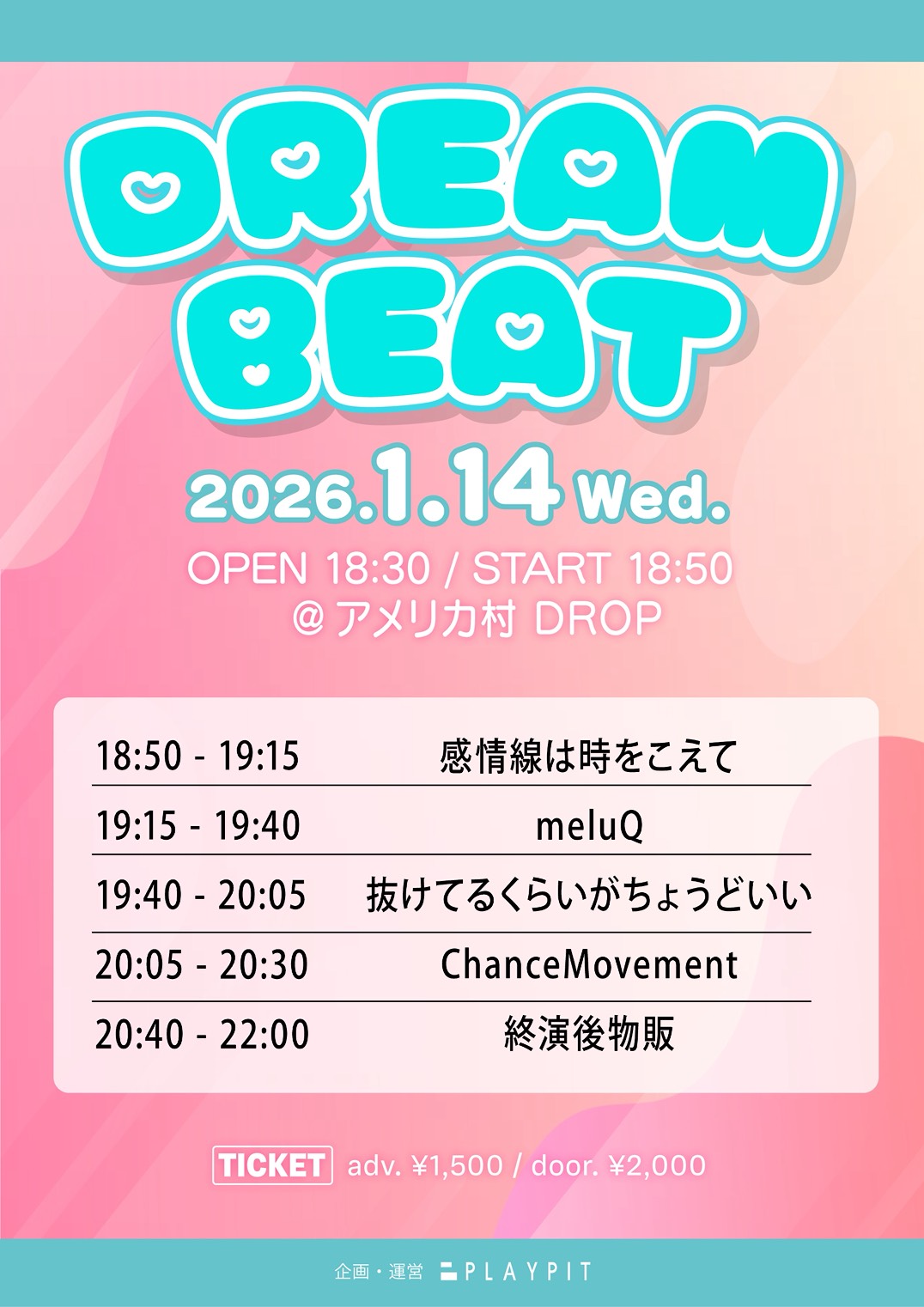 アメリカ村 DROP(ドロップ) スケジュール 2026.1.14(Wed) DREAMBEAT [ACT] meluQ / 抜けてるくらいがちょうどいい / 感情線は時をこえて /ChanceMovement [OPEN/START] 18:30/18:50 [料金] ADV.¥1,500 / DOOR.¥2,000(入場時DRINK代別途700円必要) (問)アメリカ村DROP 06-6213-9101 チケットはこちらから →https://t-dv.com/DBvol2
