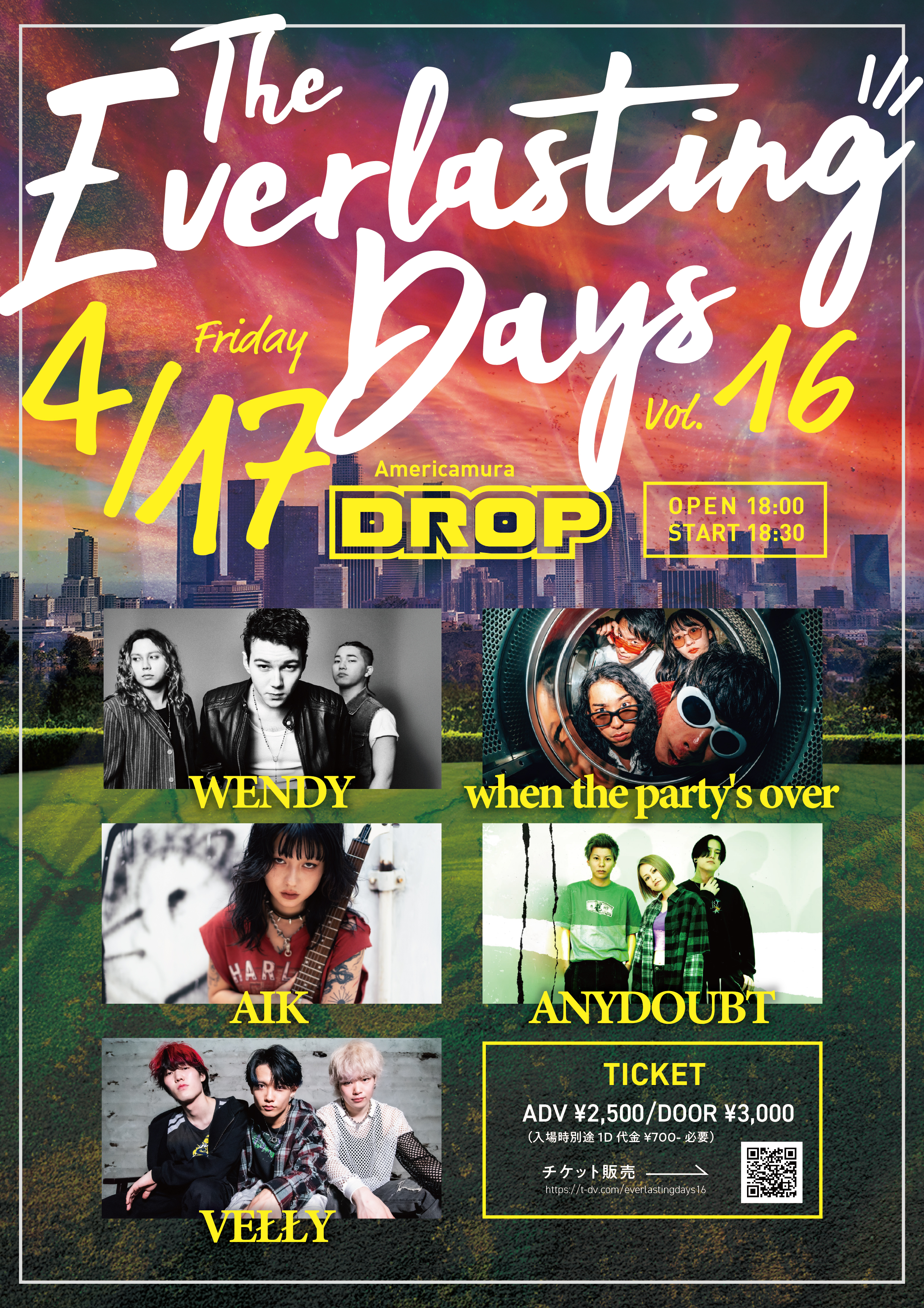 アメリカ村 DROP(ドロップ) スケジュール 2026.4.17(Fri) The Everlasting Days Vol.16 [ACT] WENDY / when the party's over / AIK / ANYDOUBT / VEŁŁY [OPEN/START] 18:00/18:30 [料金] ADV/DOOR ¥2,500/¥3,000(入場時別途1D代金¥700-必要) ▼チケット販売 https://t-dv.com/everlastingdays16 (問)アメリカ村DROP 06-6213-9101