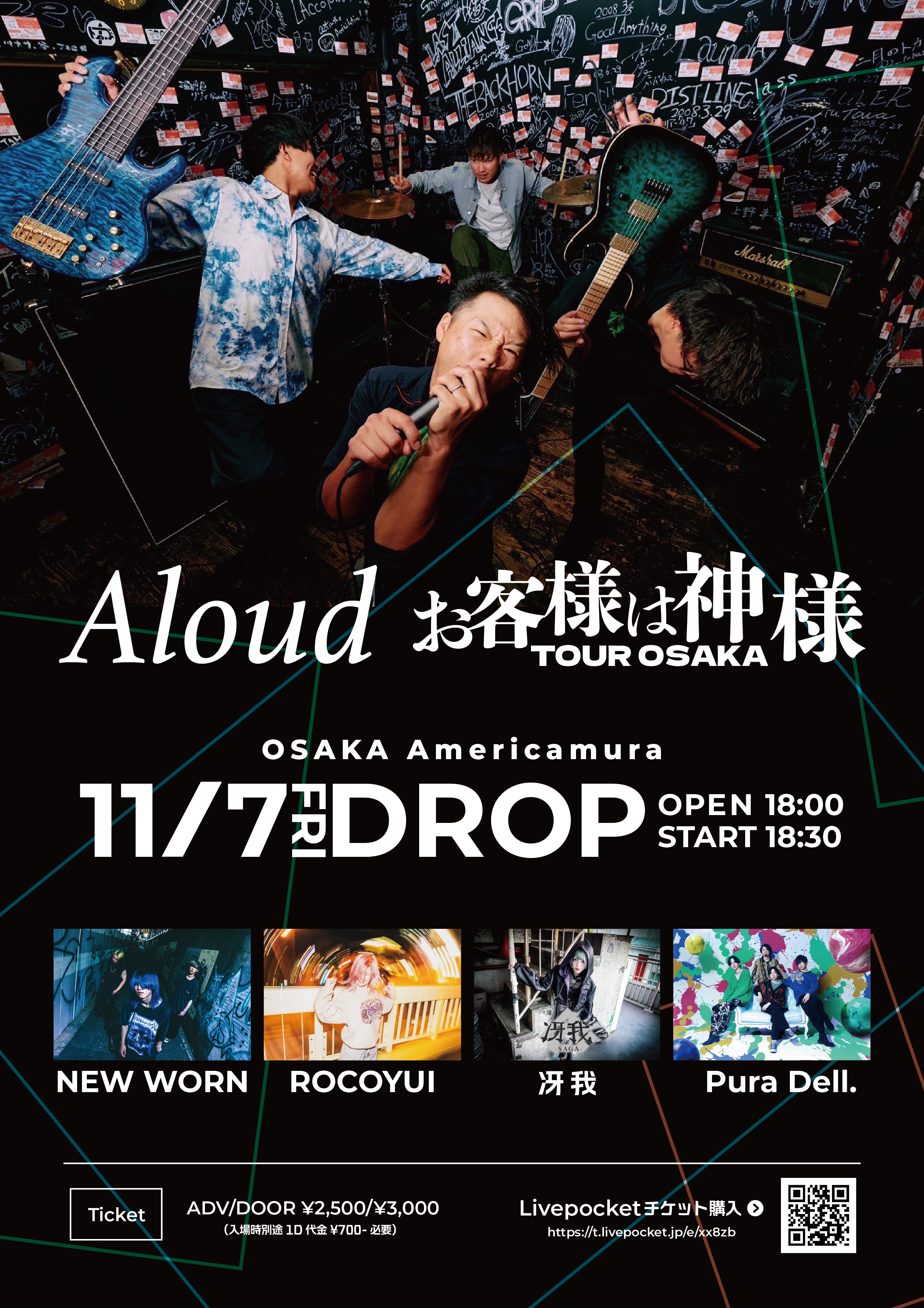 アメリカ村 DROP(ドロップ) スケジュール 2025.11.07(Fri) Aloud お客様は神様TOUR OSAKA [ACT] Aloud / NEW WORN / ROCOYUI / 冴我 / Pura Dell. [OPEN/START] 18:00/18:30 [料金] ADV/DOOR ¥2,500/¥3,000(入場時別途1D代金¥700-必要) ▼Livepocketチケット購入 https://t.livepocket.jp/e/xx8zb (問)アメリカ村DROP 06-6213-9101