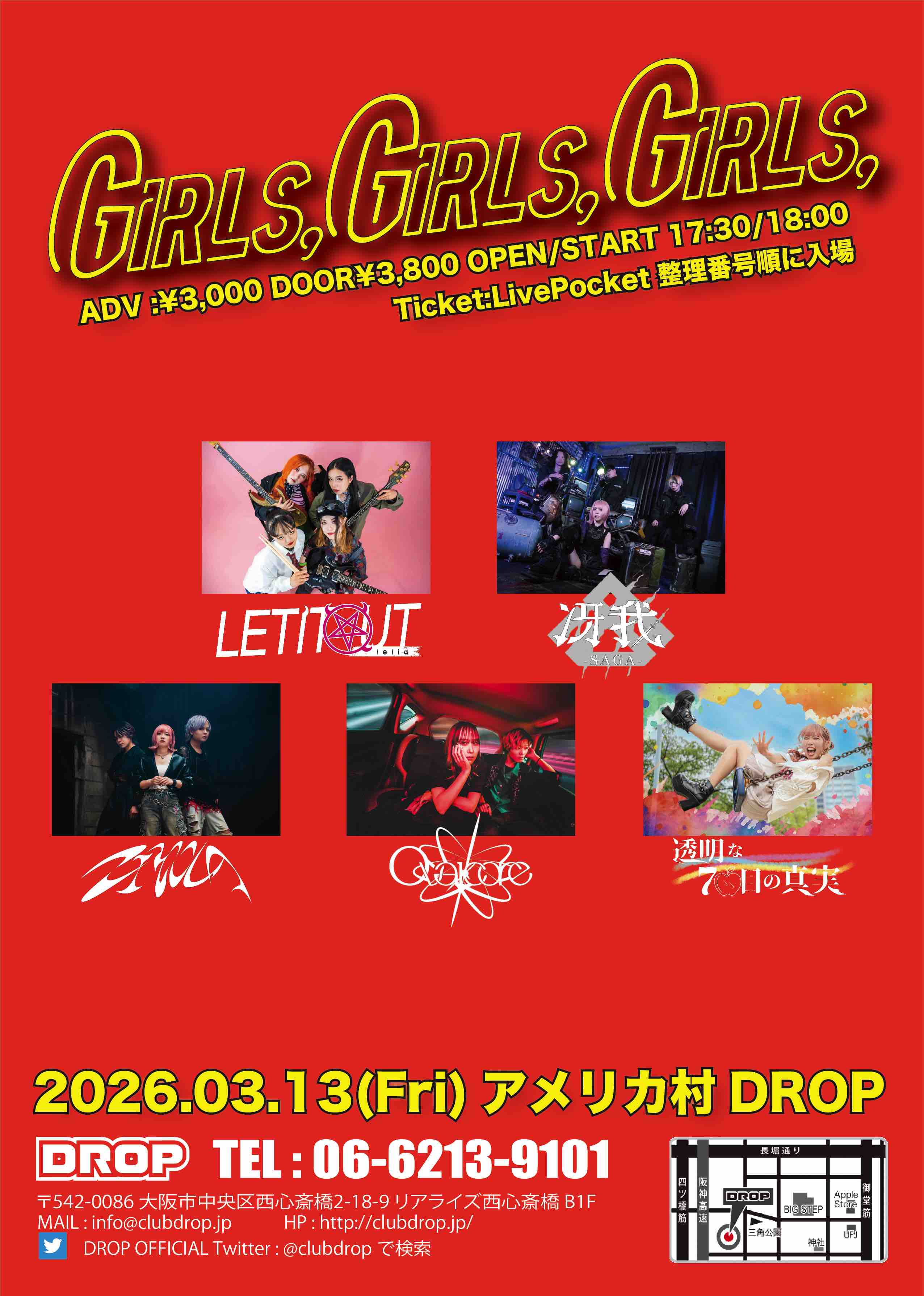 アメリカ村 DROP(ドロップ) スケジュール 2026.3.13(Fri) Girls,Girls,Girls, [ACT] LETITOUT-lelia- / 冴我 / ZIYOLA / Ovalcore / 透明な7日目の真実 [OPEN/START] 17:30/18:00 [料金] ADV/DOOR ¥3,000/¥3,800(入場時別途1D代金¥700-必要)※02/16 20:00チケット発売開始 LivePocket:https://livepocket.jp/e/973tt 入場順:整理番号順 (問)アメリカ村DROP 06-6213-9101