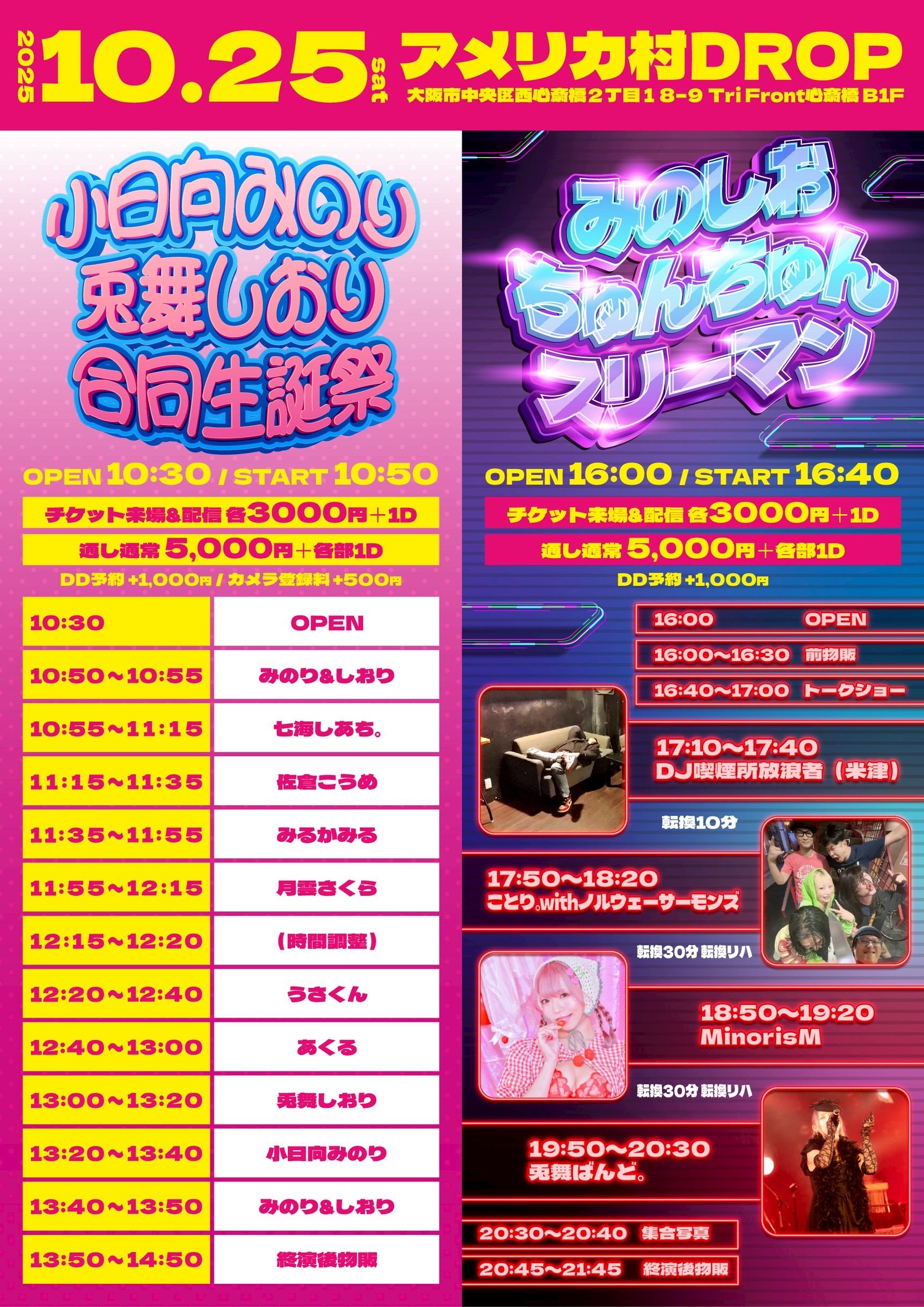 アメリカ村 DROP(ドロップ) スケジュール 2025.10.25(Sat) みのしおちゅんちゅんスリーマン [ACT] ことり。withノルウェーサーモンズ / 兎舞ばんど。/ MinorisM [OPEN/START] 16:00/16:40 [料金] 通常¥3,000- / 通し通常¥5,000(各部1D必要) / DD予約+¥1,000(入場時別途1D代金¥700-必要)/ 配信¥3,000- (問)アメリカ村DROP 06-6213-9101