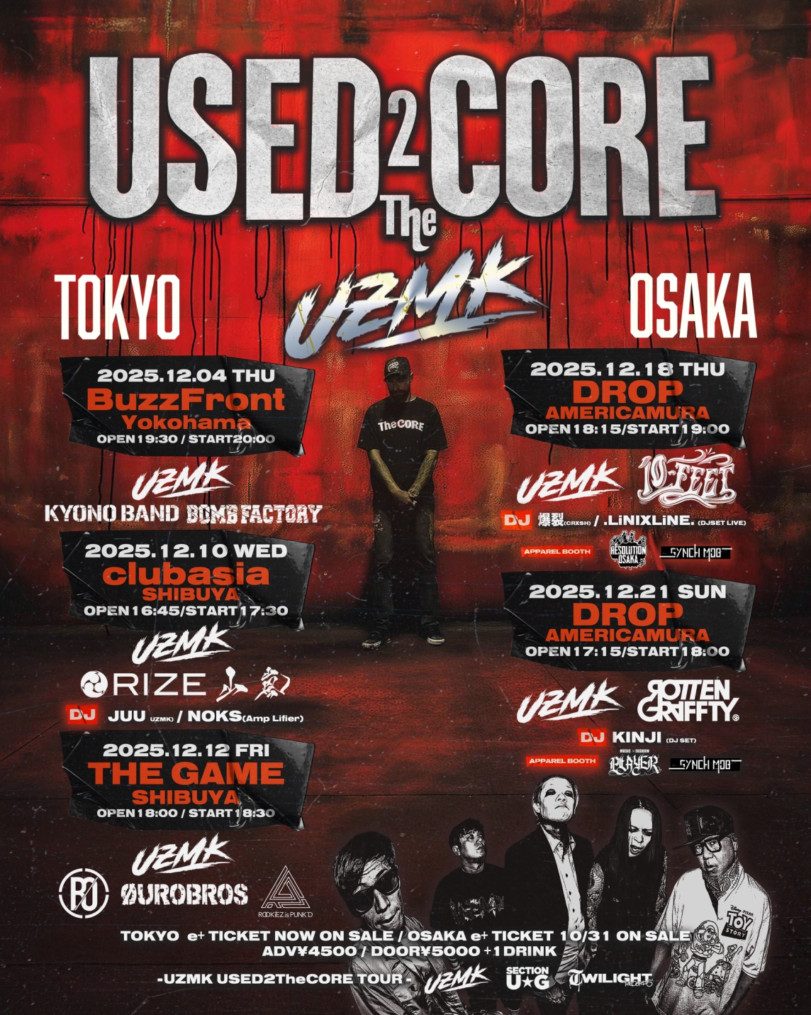 アメリカ村 DROP(ドロップ) スケジュール 2025.12.21(Sun) USED2TheCORE TOUR 大阪SERIES DAY.2 [ACT] UZMK / ROTTENGRAFFTY [DJ]KINJI(DJ SET) [APPAREL BOOTH] PLAYER / SYNCH MOB [OPEN/START] 17:15/18:00 [料金] ADV/DOOR ¥4,500/¥--(入場時別途1D代金¥700-必要) (問)アメリカ村DROP 06-6213-9101