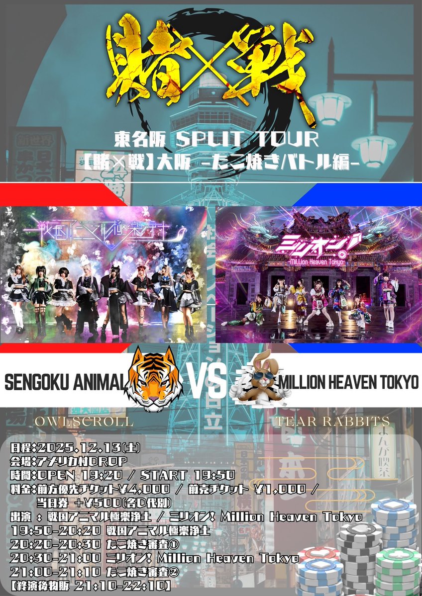 アメリカ村 DROP(ドロップ) スケジュール 2025.12.13(Sat) 戦国アニマル極楽浄土×ミリオン! Million Heaven Tokyo 東名阪 SPLIT TOUR 【賭×戦】-@大阪 たこ焼きバトル編- [ACT] 戦国アニマル極楽浄土 / ミリオン! Million Heaven Tokyo [OPEN/START] 19:20/19:50 [料金] 前方優先チケット¥4,000 / 前売チケット ¥1,000 / 当日券 ¥1,500(入場時別途1D代金¥700-必要) (問)アメリカ村DROP 06-6213-9101
