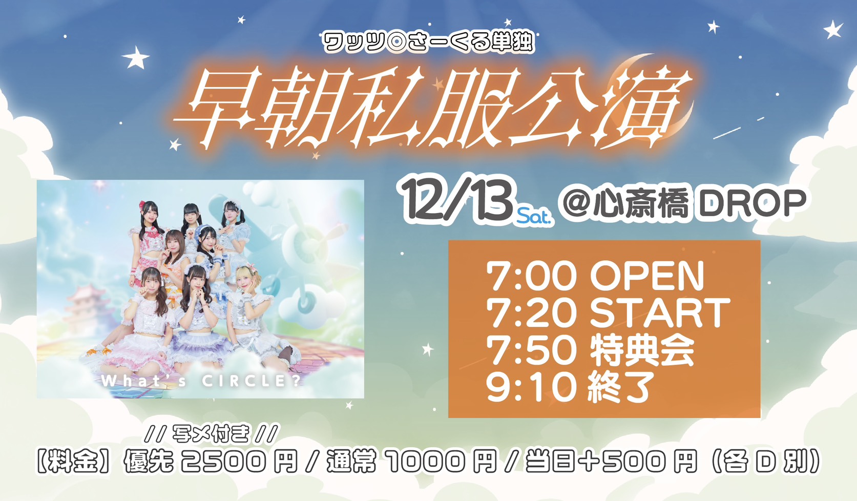アメリカ村 DROP(ドロップ) スケジュール 2025.12.12(Fri) ワッツ◎さーくる単独公演「早朝私服公演」 [ACT] ワッツ◎さーくる [OPEN/START] 7:00/7:20 [料金] 前方2500円/ 一般 1,000円/当日+500円 (各別途1D) ①優先チケット整理番号順②通常チケット整理番号順③当日券