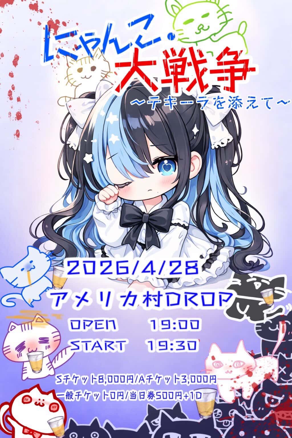 アメリカ村 DROP(ドロップ) スケジュール 2026.4.28(Tue) にゃんこ大戦争〜テキーラを添えて〜 [ACT] I.VILL [OPEN/START] 19:00/19:30 [料金] S チケット¥8,000- A チケット¥3,000- 前売り ¥0- 当日各+ ¥500-(+1D代別) (問)アメリカ村DROP 06-6213-9101