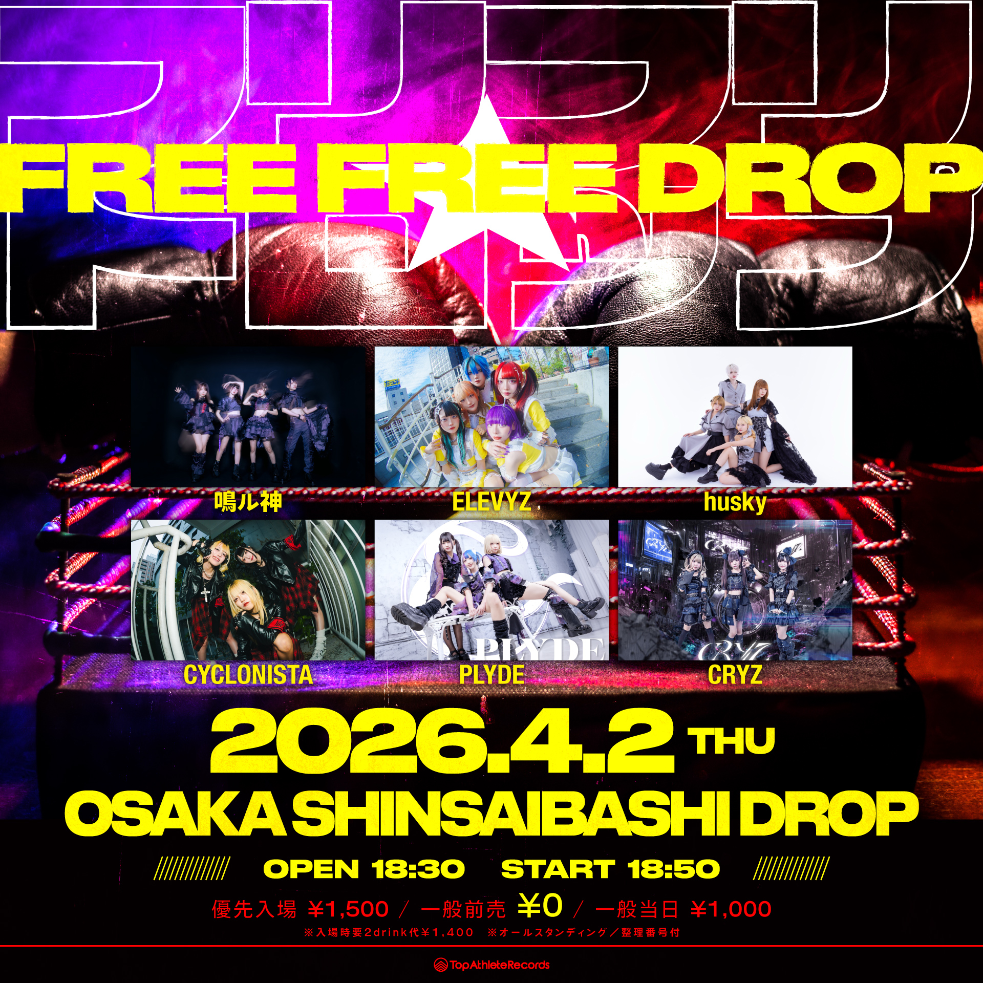 アメリカ村 DROP(ドロップ) スケジュール 2026.4.02(Thu) "フリフリ★ドロップ" -FREE FREE DROP- [ACT] 鳴ル神 / ELEVYZ / husky / CYCLONISTA / PLYDE / CRYZ [OPEN/START] 18:30/18:50 [料金] 優先入場 1,500円 / 一般前売 0円 / 一般当日 1,000円(各2D代別) ▼チケット販売 https://livepocket.jp/e/260402fd (問)アメリカ村DROP 06-6213-9101