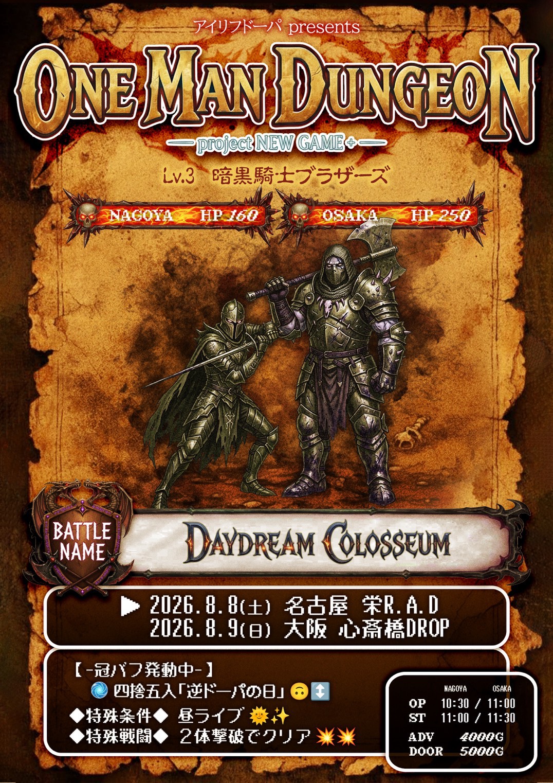 アメリカ村 DROP(ドロップ) スケジュール 2026.8.09(Sun) アイリフドーパ presents 「ONE MAN DUNGEON」 [ACT] アイリフドーパ [OPEN/START] 11:00/11:30 [料金] ADV/DOOR ¥4,000/¥5,000(入場時別途1D代金¥700-必要) (問)アメリカ村DROP 06-6213-9101