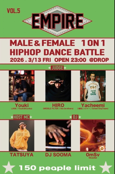 - JUDGE:Youki(JAM / Youki&Kyoka) / HIRO(MIDDLE FILTER / the brothers) / Yacheemi(餓鬼レンジャー / GreenTingTeam) HOST MC:TATSUYA DJ:DJ SOOMA / OmSv(9castle)