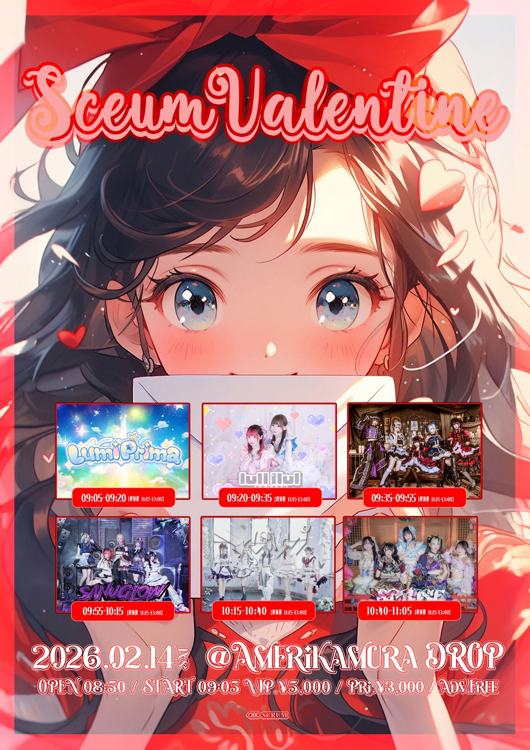 アメリカ村 DROP(ドロップ) スケジュール 2026.2.14(Sat) SceumValentine [ACT] SPRISE / アブソプ / SANUGLOW / ミラーシュカ / lullllul / Lumi Prima [OPEN/START] 8:50/9:05 [料金] VIP ¥5,000 / 優先 ¥3,000 / 一般 ¥0 (+1D) 【VIP特典:メンバーからチョコレート、ファストパス / 優先:メンバーからチョコレート】 ▼チケット https://t.co/OgC8SrGdHK (問)アメリカ村DROP 06-6213-9101