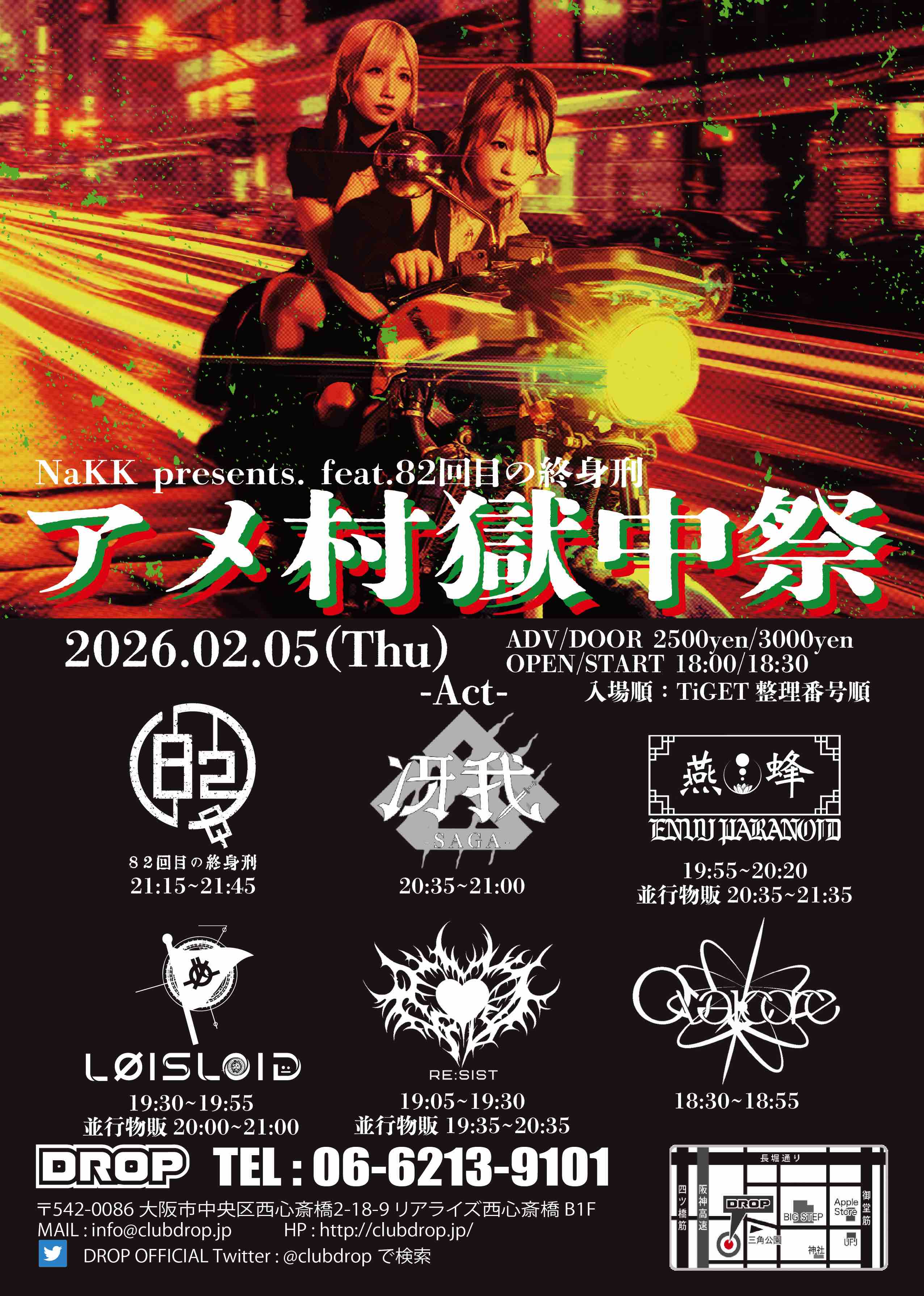 アメリカ村 DROP(ドロップ) スケジュール 2026.2.05(Thu) NaKK presents. アメ村獄中祭 feat.82回目の終身刑 [ACT] 82回目の終身刑 / 冴我 / Ovalcore / ENVY PARANOID / Re:sist / LØISLOID [OPEN/START] 18:00/18:30 [料金] ADV/DOOR ¥2,500/¥3,000(入場時別途1D代金¥700-必要) 入場順:TiGET整理番号順 TiGET:https://tiget.net/events/461158 01/23 22:00予約開始 (問)アメリカ村DROP 06-6213-9101