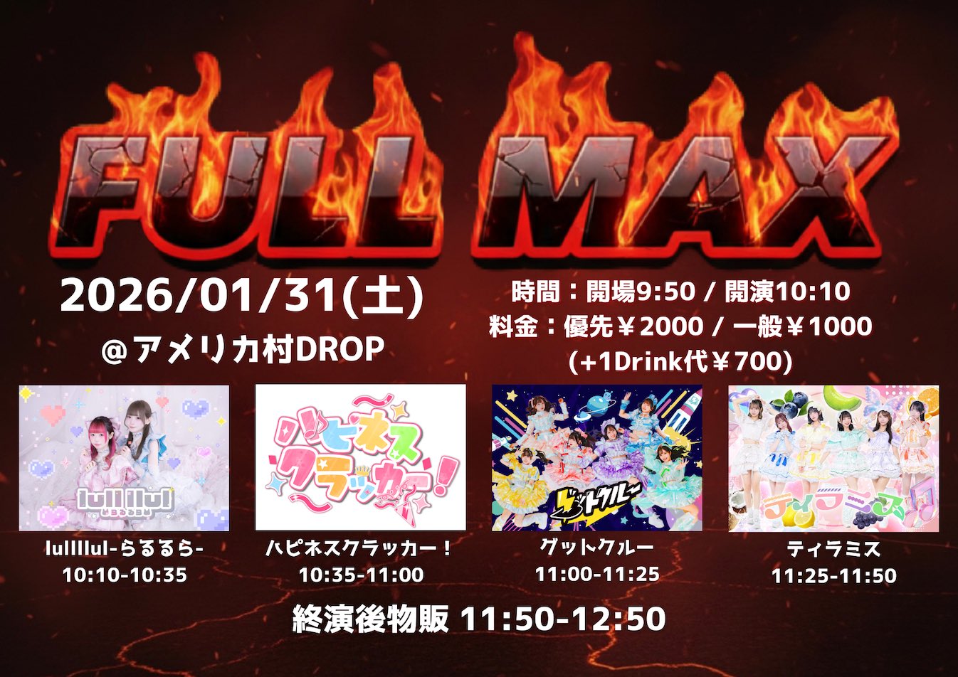 アメリカ村 DROP(ドロップ) スケジュール 2026.1.31(Sat) 『FULL MAX』 [ACT] グットクルー/ティラミス/ハピネスクラッカー!/lullllul-らるるら- [OPEN/START] 9:50/10:10 [料金] 優先¥2000 / 一般¥1000(+1Drink代¥700) (問)アメリカ村DROP 06-6213-9101