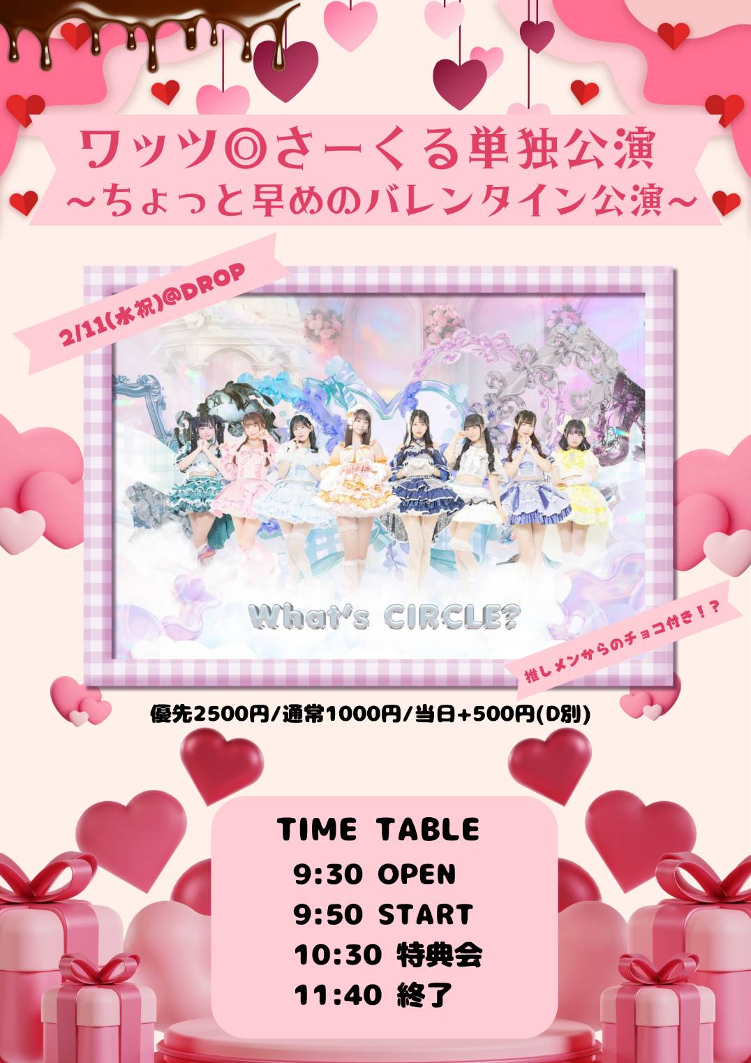 アメリカ村 DROP(ドロップ) スケジュール 2026.2.11(Wed) 「ワッツ◎さーくる単独公演 〜ちょっと早めのバレンタイン公演〜」 [ACT] ワッツ◎さーくる [OPEN/START] 9:30/9:50 [料金] 優先2500円/通常1000円/当日+500円(入場時別途1D代金¥700-必要) ▼ 入場順 ①前方チケット整理番号順②通常チケット整理番号順③当日券 (問)アメリカ村DROP 06-6213-9101