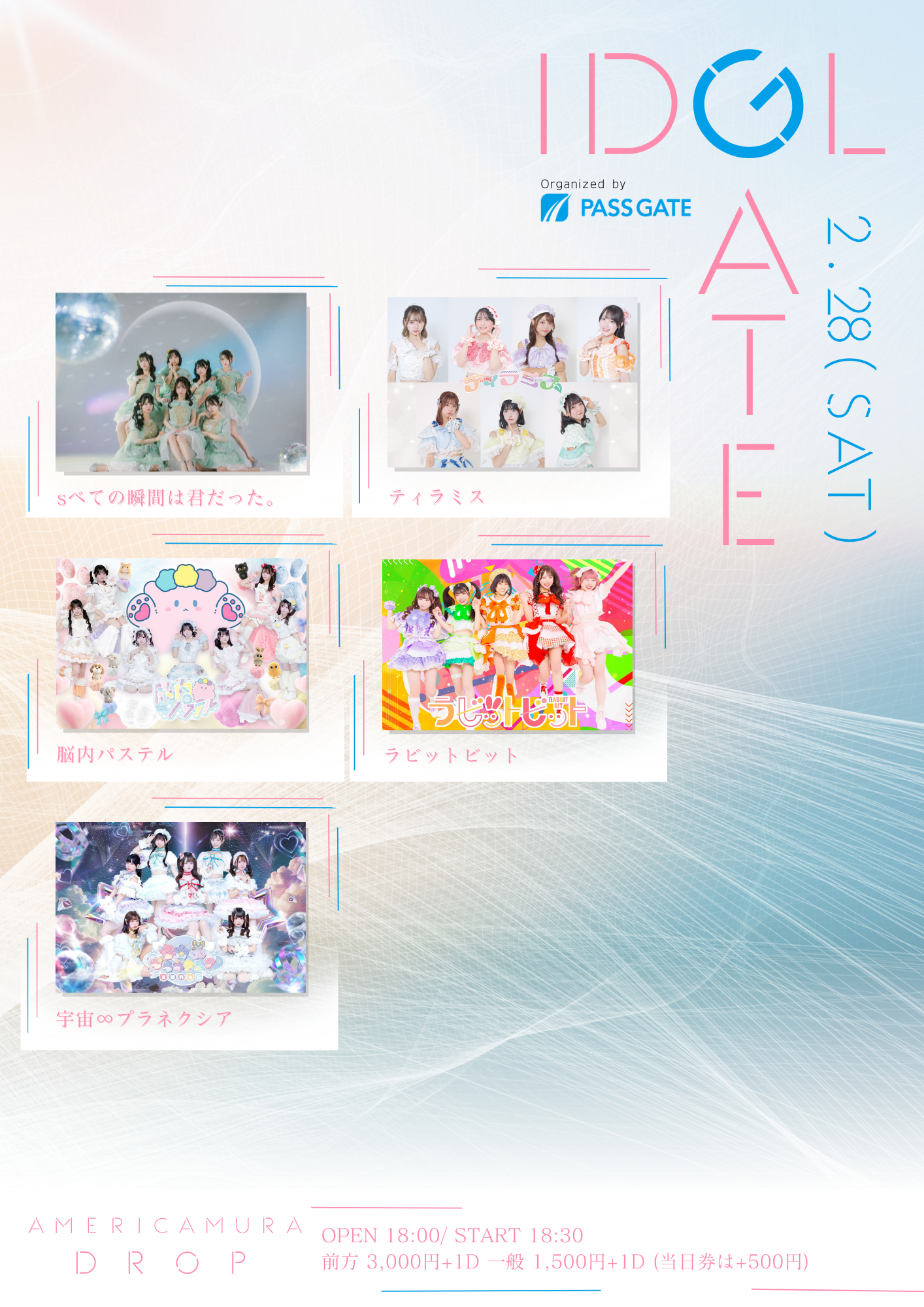 アメリカ村 DROP(ドロップ) スケジュール 2026.2.28(Sat) IDOL GATE in DROP【NIGHT】 [ACT] すべての瞬間は君だった。/ティラミス/脳内パステル/宇宙∞プラネクシア/ラビットビット [OPEN/START] 2部:OPEN 18:00 START 18:30 [料金] 前方¥3,000/一般¥1,500(各+1D) ※当日券は各+¥500 【チケットURL】https://t-dv.com/idolgate_drop_night