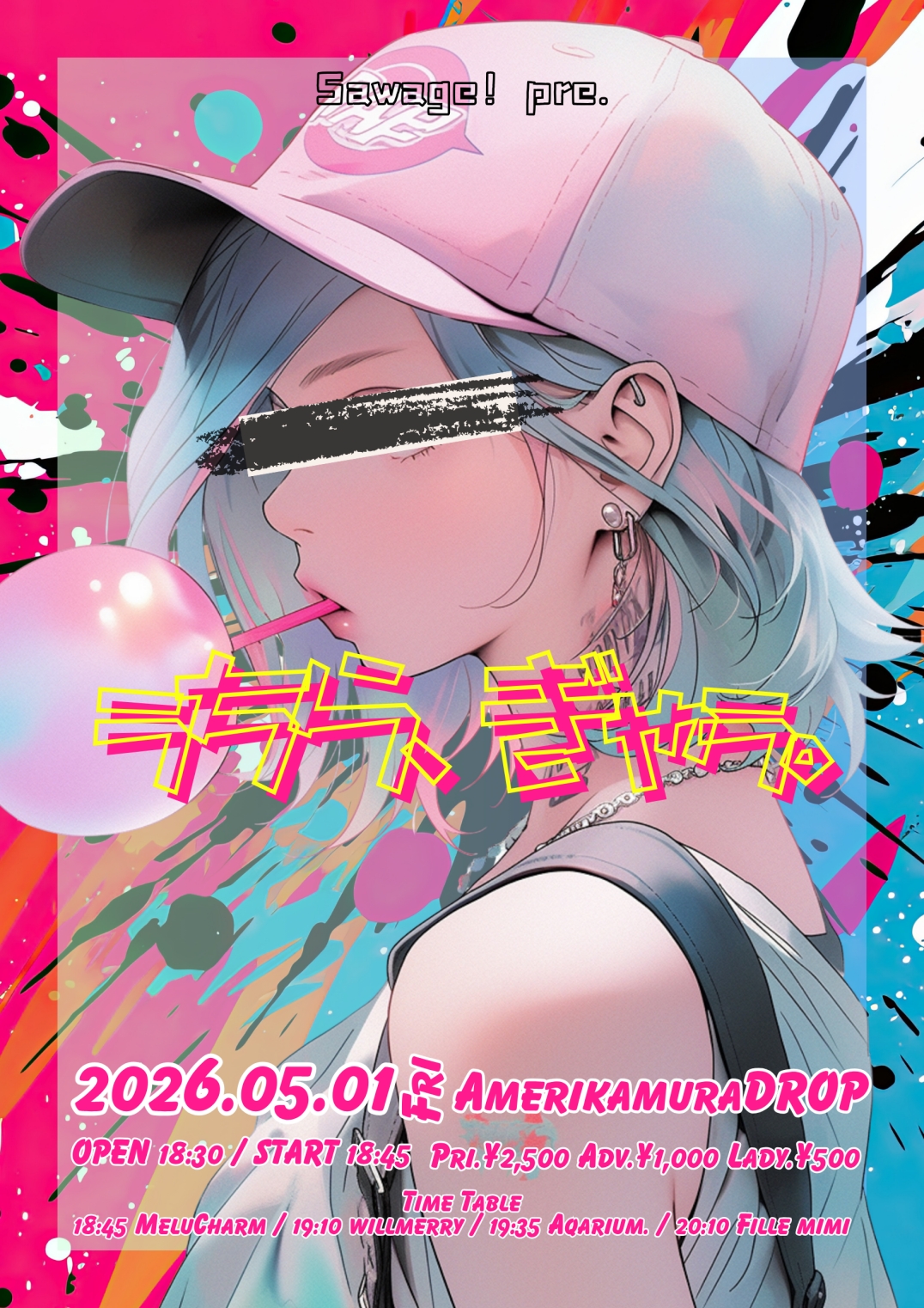 アメリカ村 DROP(ドロップ) スケジュール 2026.5.01(Fri) Sawage!pre.『ぅちら、ぎゃぅ。』 [ACT] アクアリウム。/ Fille mimi / MeluCharm / うぃるめり! [OPEN/START] OPEN 18:30 / START 18:45 [料金] 優先 ¥2,500 一般¥1,000 女性¥500 当日 各種+¥500(+1D) 予約:https://t-dv.com/ZiEdFX66xKVmer2uaRGd ※4月14日21:00〜