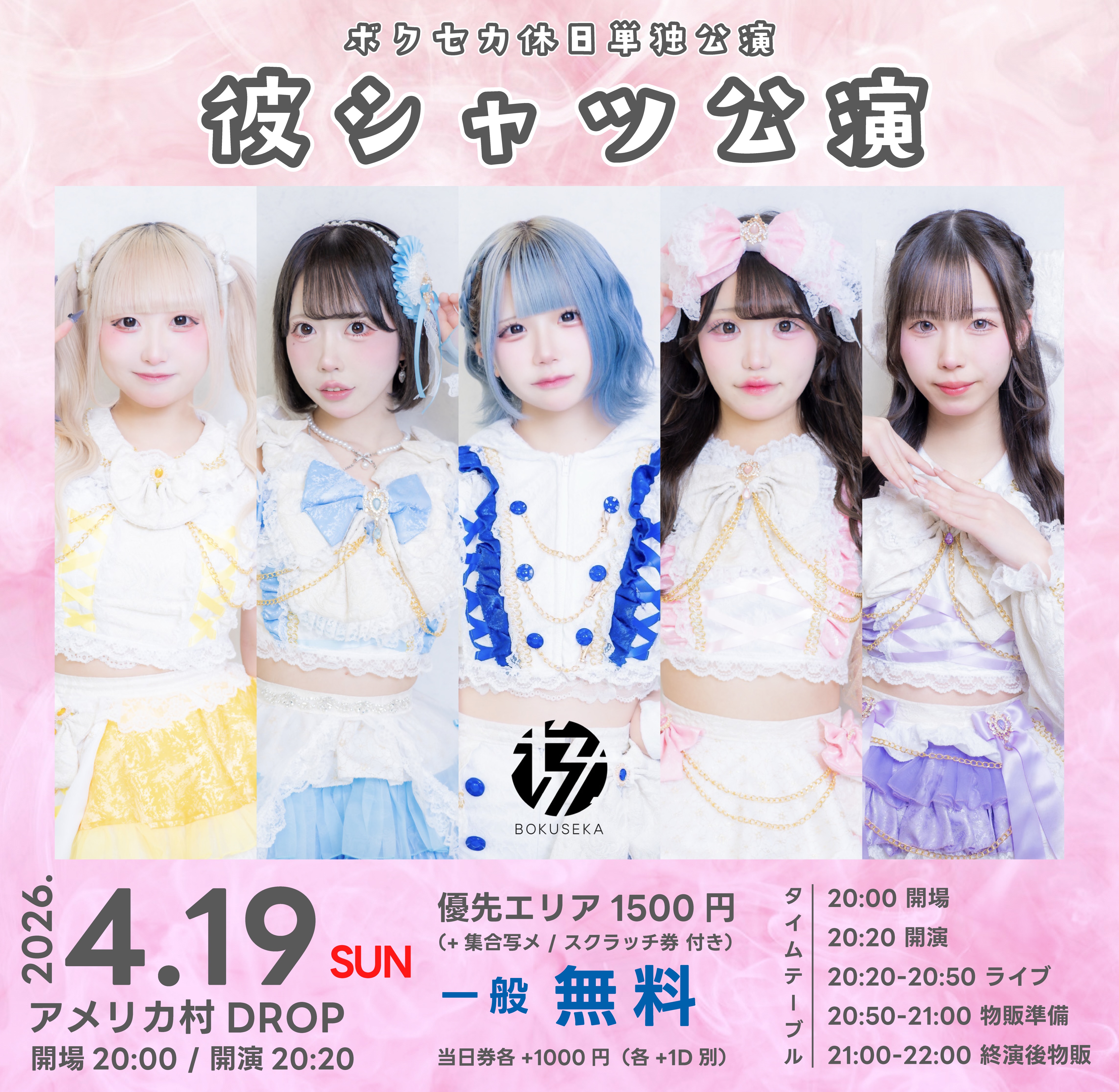 アメリカ村 DROP(ドロップ) スケジュール 2026.4.19(Sun) ボクセカ休日単独公演 -彼シャツ公演- [ACT] ボクセカ [OPEN/START] 20:00/20:20 [料金] 優先エリア¥1500 / 一般 ¥0 / 当日券 各+¥1000(入場時別途1D代金¥700-必要) ■ チケットURL:https://t-dv.com/419kareshirt (開演時間までTicketDiveにて前売販売) (問)アメリカ村DROP 06-6213-9101