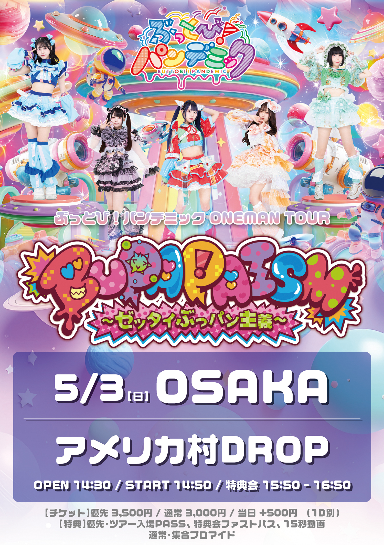 アメリカ村 DROP(ドロップ) スケジュール 2026.5.03(Sun) ぶっとび!パンデミック ONEMAN TOUR -BUPAPAISM- 大阪公演 [ACT] ぶっとび!パンデミック [OPEN/START] 14:30/14:50 [料金] 優先¥3,500/通常¥3,000(当日共に¥500UP/入場時別途1D代金¥700-必要) (問)アメリカ村DROP 06-6213-9101