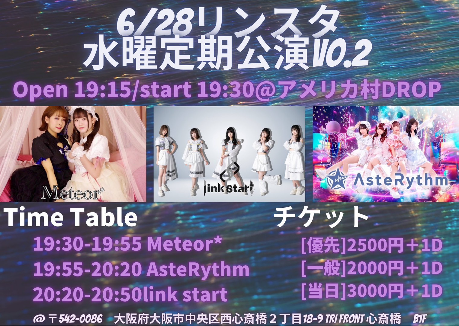 アメリカ村 DROP(ドロップ) スケジュール 2023.6.28(Wed) 「リンスタ水曜定期公演vo.2」 [ACT] Meteor* / AsteRythm / link start [OPEN/START] 19:15/19:30 [料金] [優先]2500円 [一般]2000円 [当日]3000円(入場時別途1D代金¥600-必要) チケット 6/10(水)22:35〜 https://t.livepocket.jp/e/0628_linstateiki (問)アメリカ村DROP 06-6213-9101
