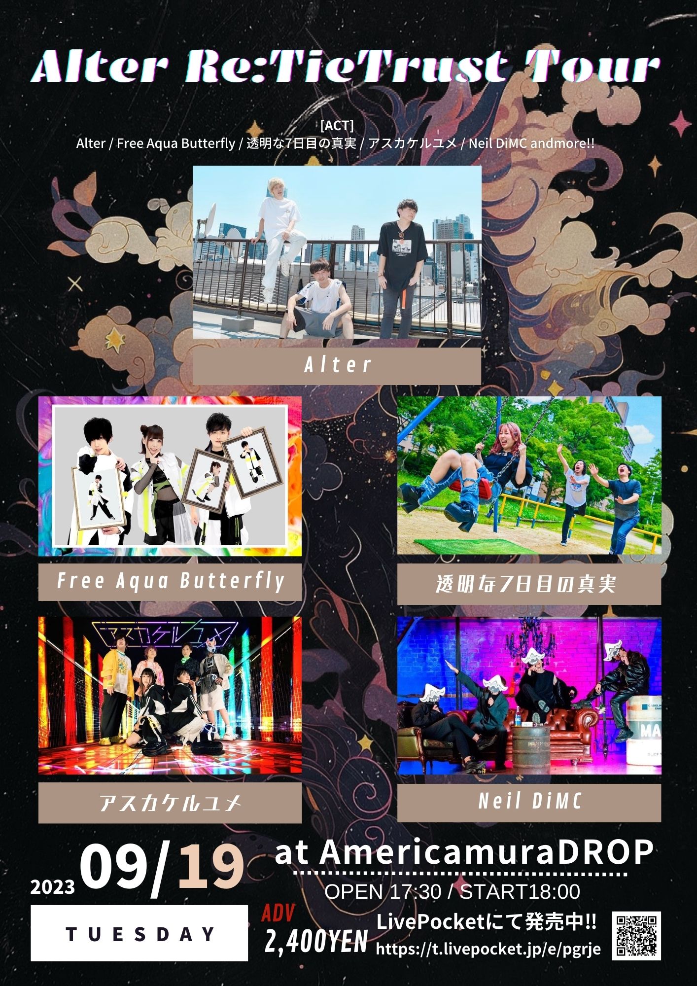 アメリカ村 DROP(ドロップ) スケジュール 2023.9.19(Tue) Alter Re:TieTrust Tour [ACT] Alter / Free Aqua Butterfly / 透明な7日目の真実 / アスカケルユメ / Neil DiMC [OPEN/START] 18:00/18:30 [料金] ADV/DOOR ¥2,400/¥2,900(入場時別途1D代金¥600-必要) ▼チケット購入 https://t.livepocket.jp/e/pgrje (問)アメリカ村DROP 06-6213-9101