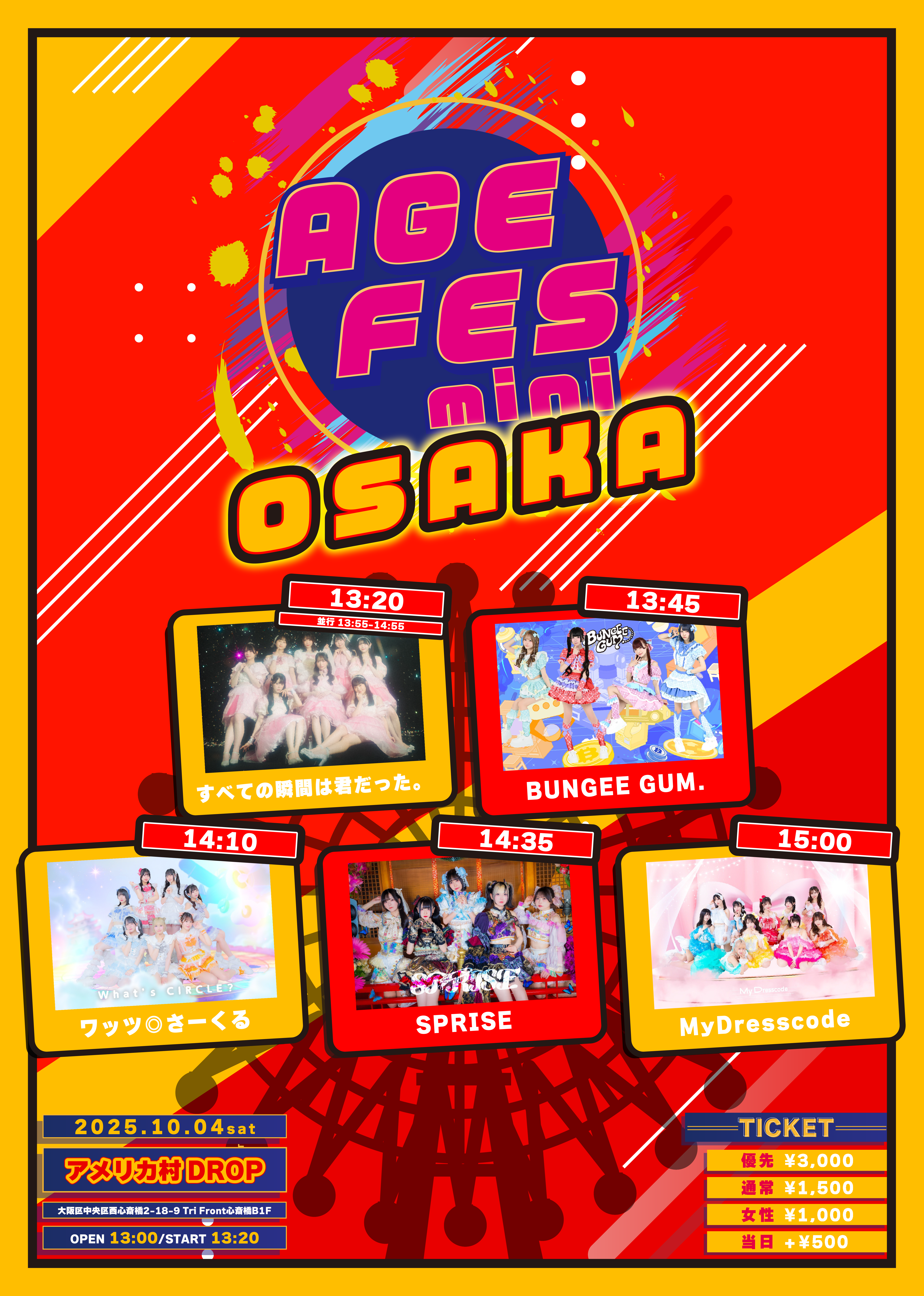 アメリカ村 DROP(ドロップ) スケジュール 2025.10.04(Sat) AGE FES mini in OSAKA [ACT] ワッツ◎さーくる / SPRISE / MyDresscode / BUNGEE GUM. / すべての瞬間は君だった。 / 他 [OPEN/START] 13:00/13:20 [料金] 前売優先3000円/前売通常1500円/前売女性1000円/当日+500円(D別) ▼入場順:①前売優先整理番号順②前売通常整理番号順③前売女性整理番号順④当日