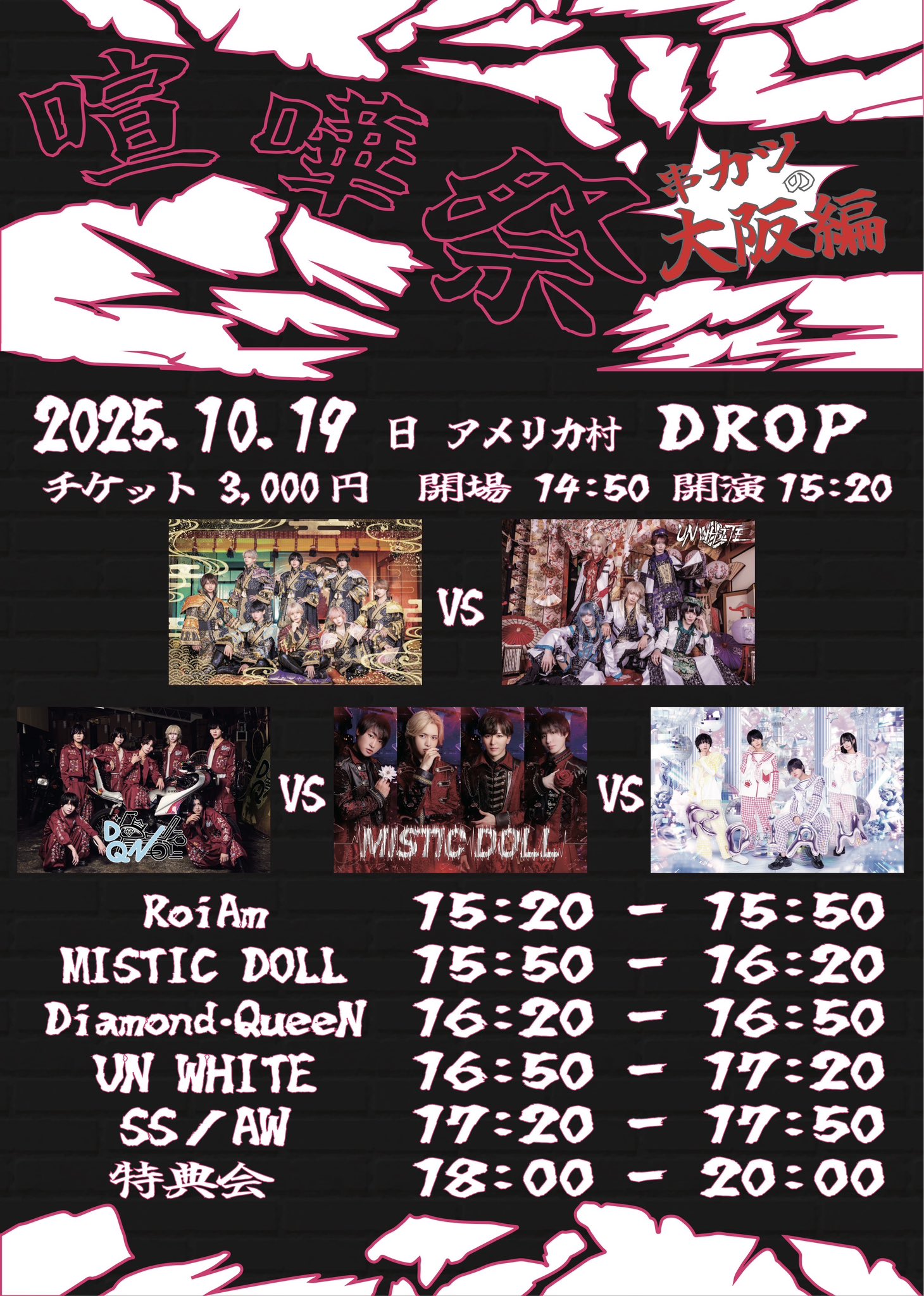 アメリカ村 DROP(ドロップ) スケジュール 2025.10.19(Sun) 喧嘩祭~串カツ大阪編~ [ACT] SS/AW / UN WHITE / Diamond-QueeN / MISTIC DOLL / RoiAm [OPEN/START] 14:50/15:20 [料金] TICKET ¥3,000-(入場時別途1D代金¥700-必要) LivePocket https://t.co/613guqVZAb (問)アメリカ村DROP 06-6213-9101