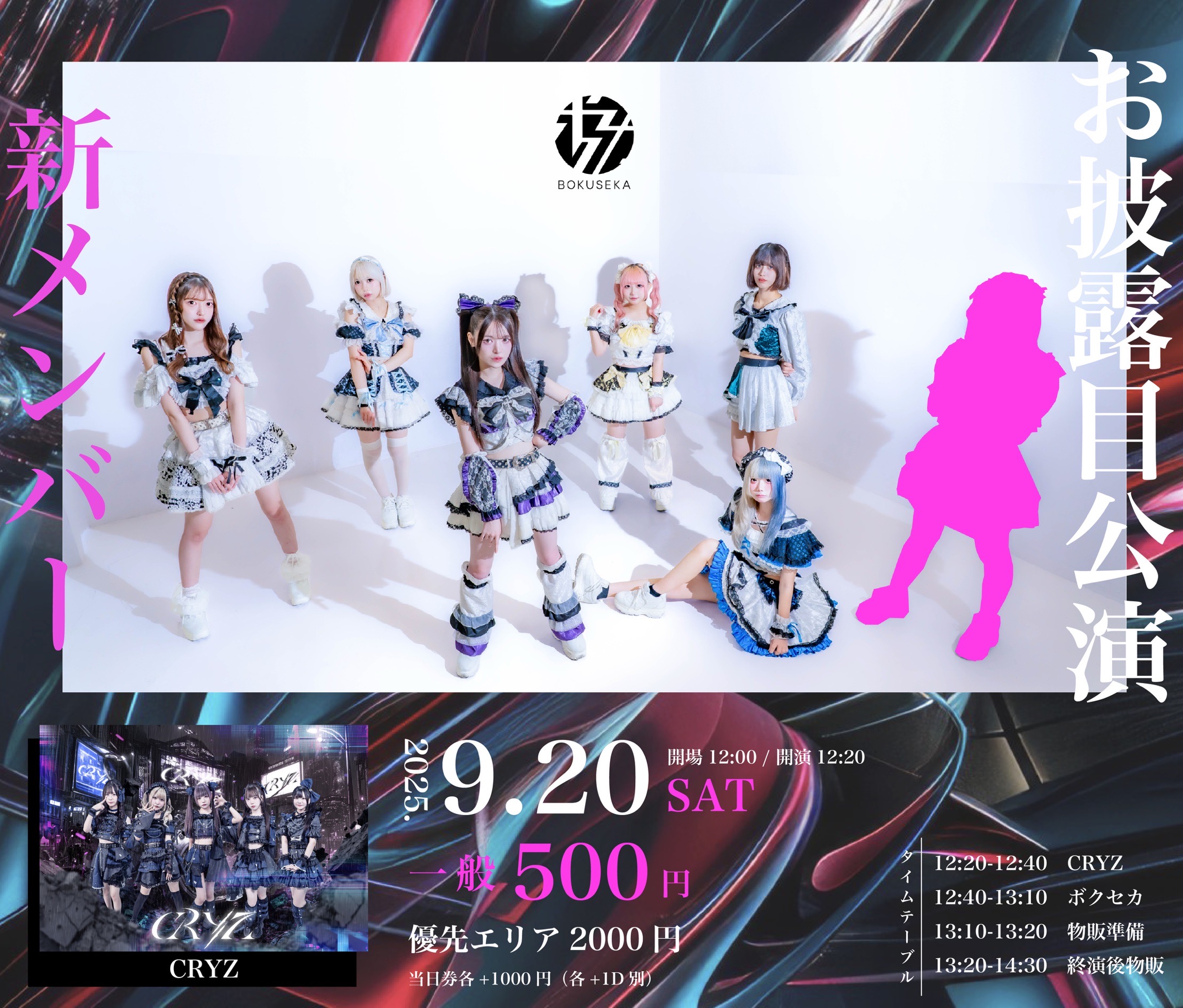 アメリカ村 DROP(ドロップ) スケジュール 2025.9.20(Sat) ボクセカ 新メンバーお披露目公演 [ACT] ボクセカ / CRYZ [OPEN/START] 12:00/12:20 [料金] 優先エリア 2000円 / 一般 500円 / 当日券 各+1000円(入場時別途1D代金¥700-必要) ■チケットURL https://t-dv.com/bksk_newmem0916 (問)アメリカ村DROP 06-6213-9101