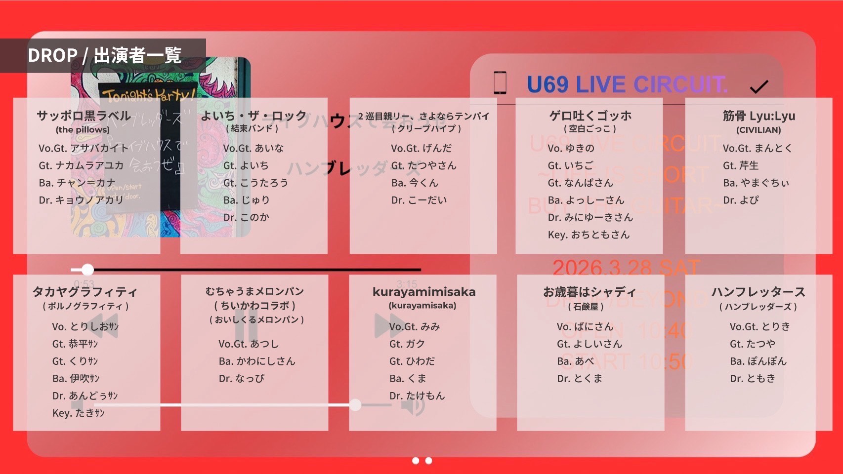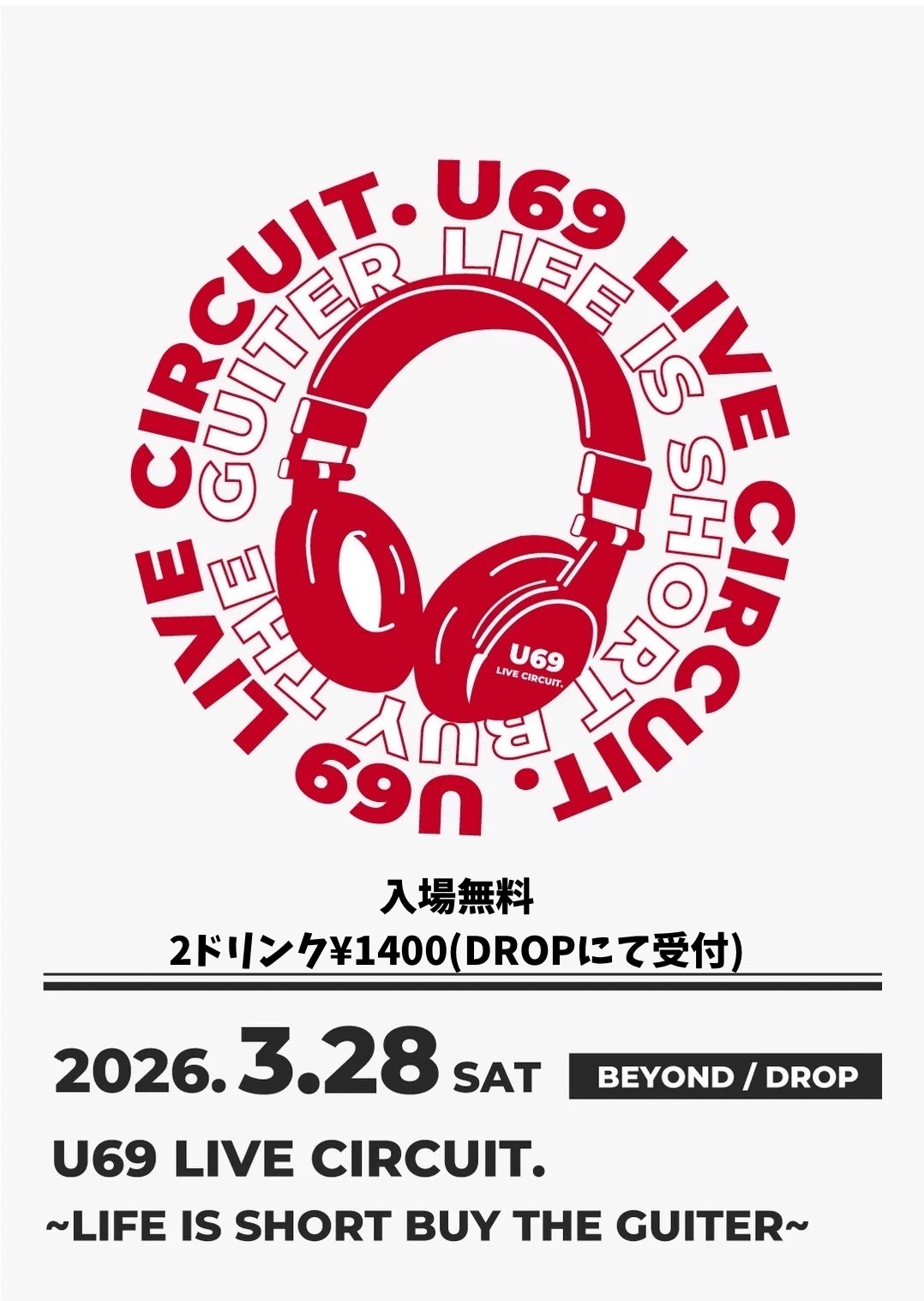 アメリカ村 DROP(ドロップ) スケジュール 2026.3.28(Sat) U69 LIVE CIRCUIT. ~LIFE IS SHORT BUY THE GUITAR~ [ACT] サッポロ黒ラベル / よいち・ザ・ロック / 2巡目親リー、さよならテンパイ / ゲロ吐くゴッホ / 筋骨Lyu:Lyu / タカヤグラフィティ / むちゃうまメロンパン(ちいかわコラボ)/ kurayamimisaka / お歳暮はシャディ / ハンフレッタース [OPEN/START] 10:40/11:15 [料金] 無料(別途2drink代¥1,400必要) (問)アメリカ村DROP 06-6213-9101