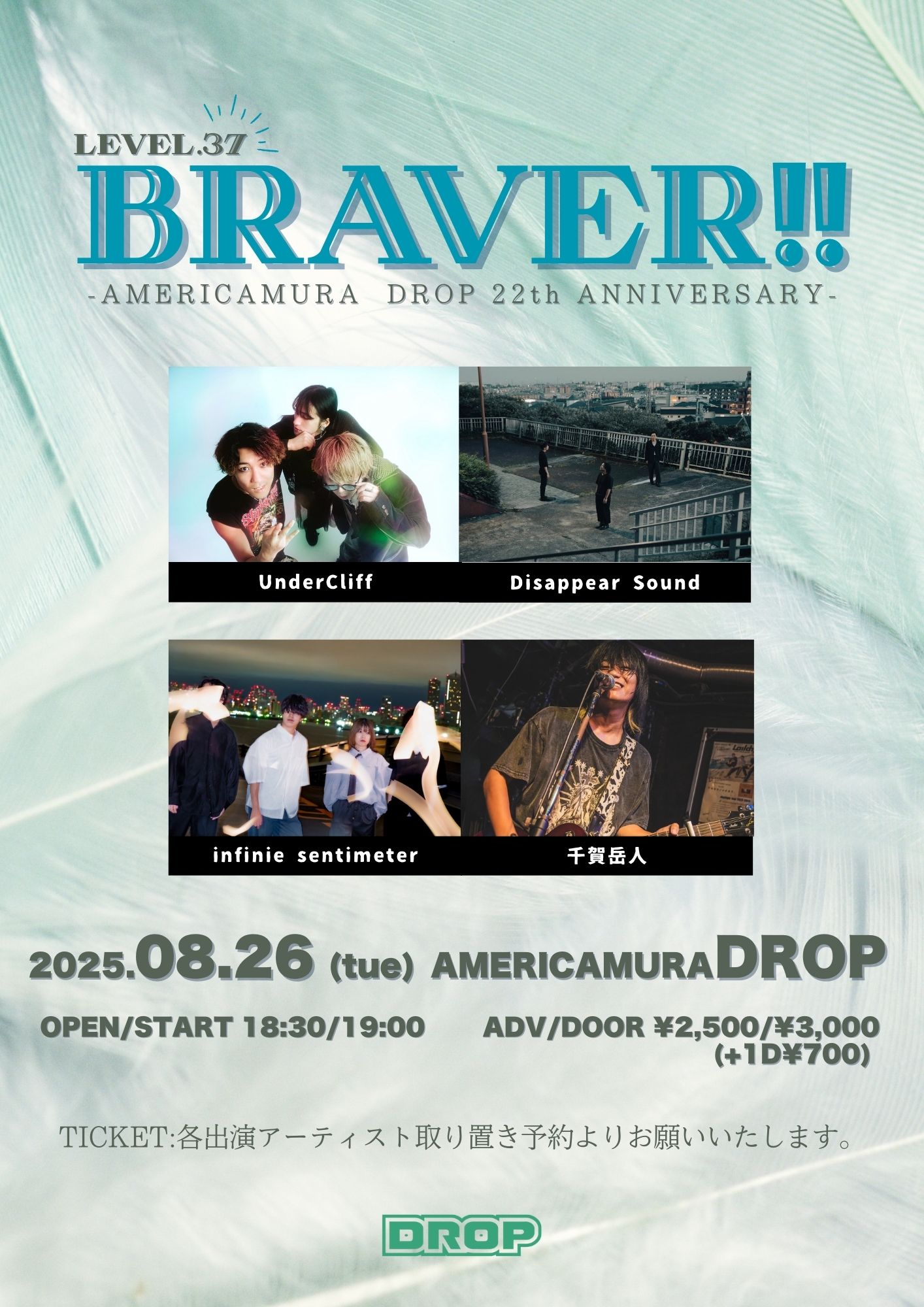 アメリカ村 DROP(ドロップ) スケジュール 2025.8.26(Tue) BRAVER!! Level.37-AMERICAMURA DROP 22th ANNIVERSARY- [ACT] UnderCliff / Disappear Sound / infinite sentimeter / 千賀岳人 [OPEN/START] 18:30/19:00 [料金] ADV/DOOR ¥2500/¥3000(入場時別途1D代金¥700-必要) (問)アメリカ村DROP 06-6213-9101