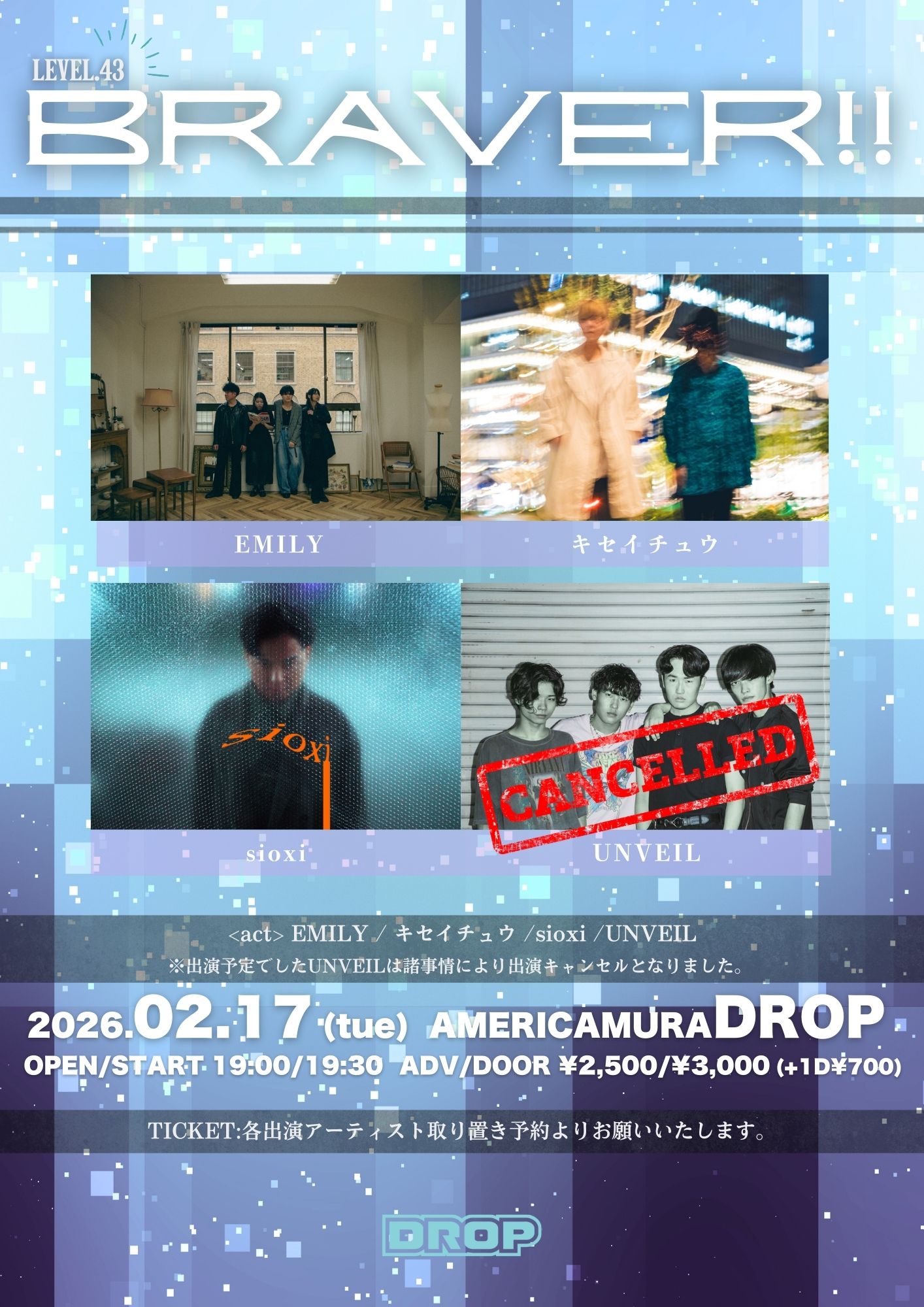 アメリカ村 DROP(ドロップ) スケジュール 2026.2.17(Tue) BRAVER!! LEVEL.43 [ACT] EMILY / キセイチュウ / sioxi ※出演予定でしたUNVEILは諸事情により出演キャンセルとなりました。 [OPEN/START] 19:00/19:30 [料金] ADV/DOOR ¥2500/¥3000(入場時別途1D代金¥700-必要) (問)アメリカ村DROP 06-6213-9101