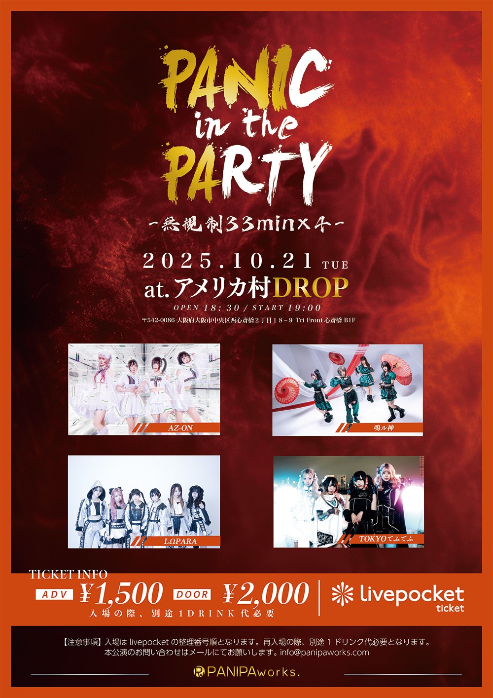 アメリカ村 DROP(ドロップ) スケジュール 2025.10.21(Tue) PANIC in the PARTY-無規制33min×4- [ACT] AZ-ON / 鳴ル神 / LΩPARA / TOKYOてふてふ [OPEN/START] 18:30/19:00 [料金] 前売り ¥1500 / 当日 ¥2000 ※入場の際、別途1ドリンク代必要 URL:https://t.livepocket.jp/e/panicintheparty-1021-