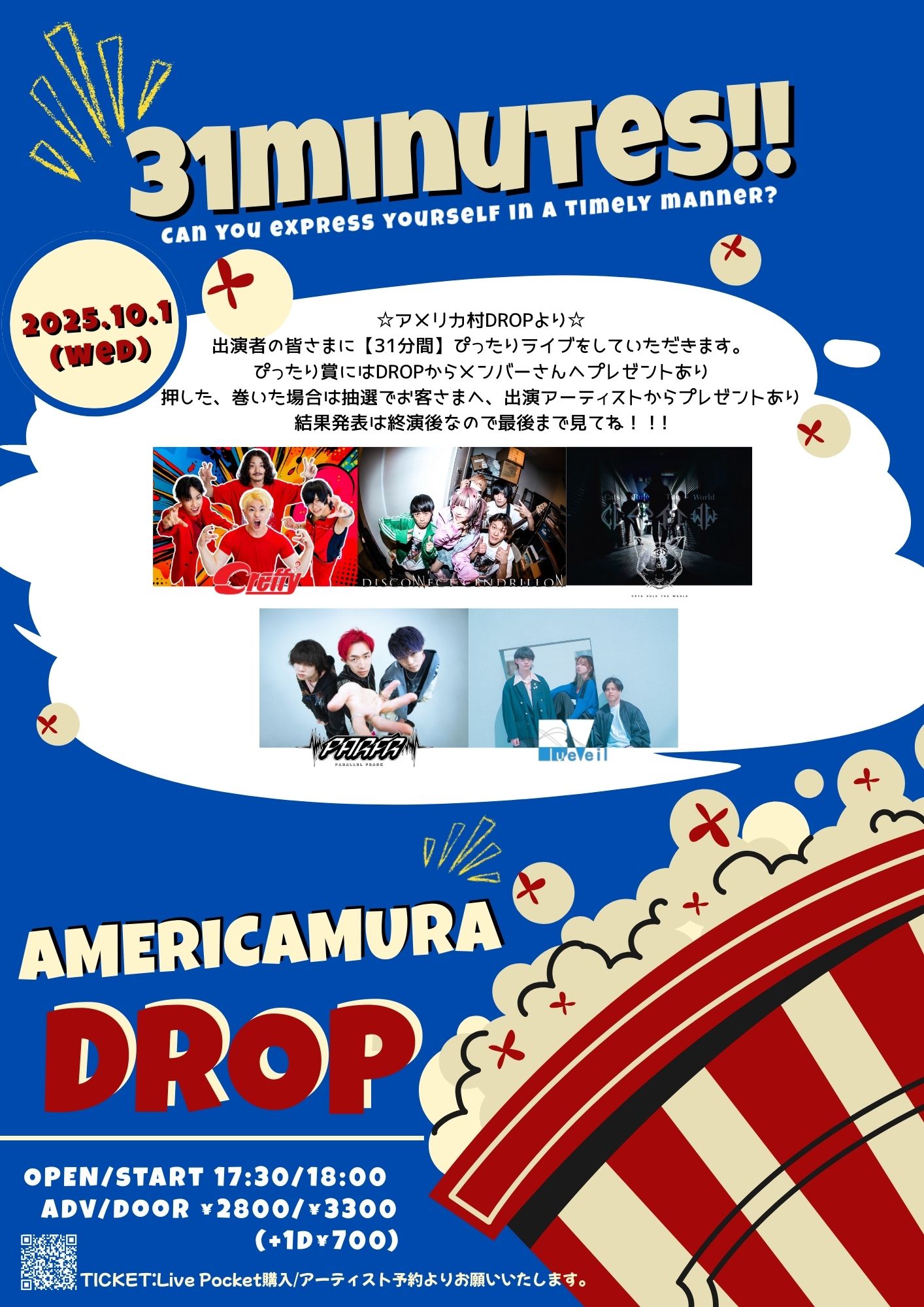 アメリカ村 DROP(ドロップ) スケジュール 2025.10.01(Wed) 31minutes!!! [ACT] Disconnect Cendrillon / Creffy(東京) / Parallel Frank/BlueVeil / Cats Rule The World [OPEN/START] 17:30/18:00 [料金] ADV/DOOR ¥2800/¥3300(入場時別途1D代金¥700-必要) (問)アメリカ村DROP 06-6213-9101