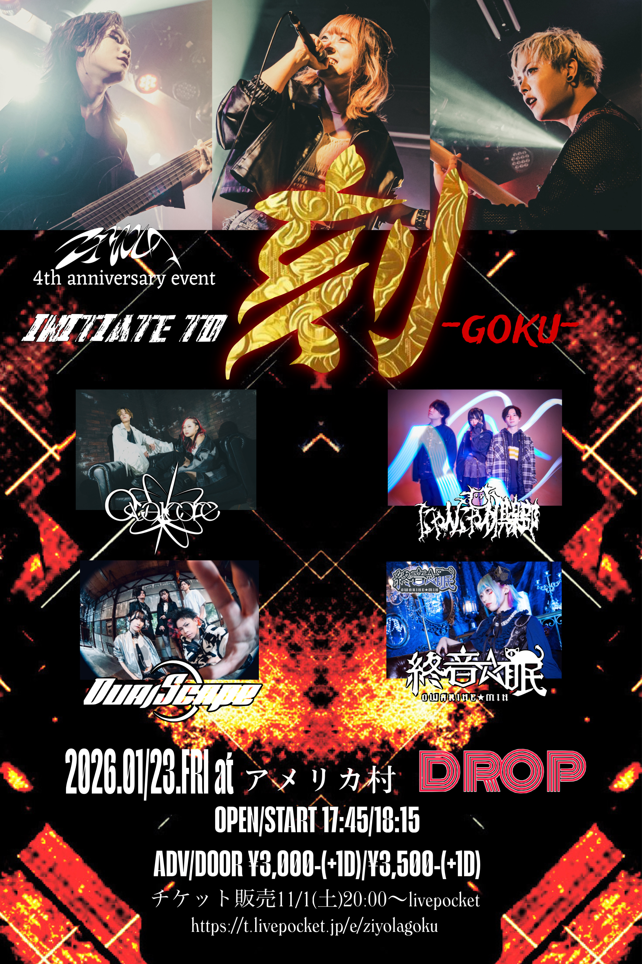 アメリカ村 DROP(ドロップ) スケジュール 2026.1.23(Fri) ZIYOLA 4周年Anniversary event initiate to 刻-GOKU- [ACT] ZIYOLA / Dualscape / にゃんにゃん倶楽部 / Ovalcore / 終音☆眠 [OPEN/START] 17:45/18:15 [料金] ADV/DOOR ¥3,000/¥3,500(入場時別途1D代金¥700-必要) Livepocketチケット販売 https://t.livepocket.jp/e/ziyolagoku (問)アメリカ村DROP 06-6213-9101