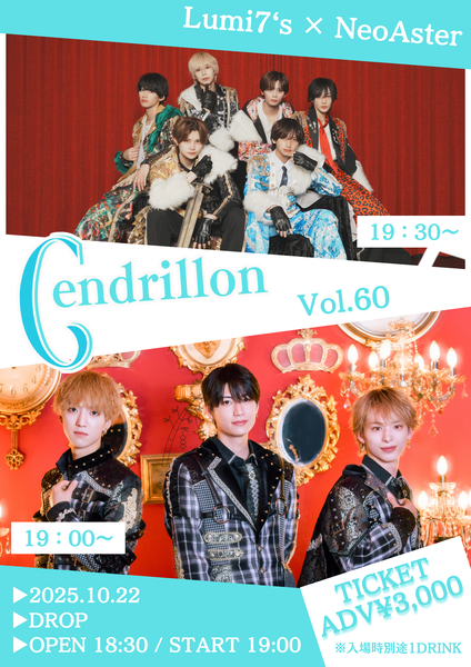 アメリカ村 DROP(ドロップ) スケジュール 2025.10.22(Wed) 『Cendrillon-vol.60-』 [ACT] Lumi7's / NeoAster [OPEN/START] 18:30/19:00 [料金] ADV/¥3,000 ADM/¥3,500(入場時別途1D代金¥700-必要) [チケットURL] t.livepocket.jp/e/gp78r 入場順:ライブポケット番号順→当日券 チケットはライブポケットでの販売のみとなります。取り置きはございません。 OPEN時間10分前より整列開始いたします。 整列開始後到着されたお客様は、最後尾でのご案内となりますので予めご了承ください。 (問)株式会社Cinderella entertainment