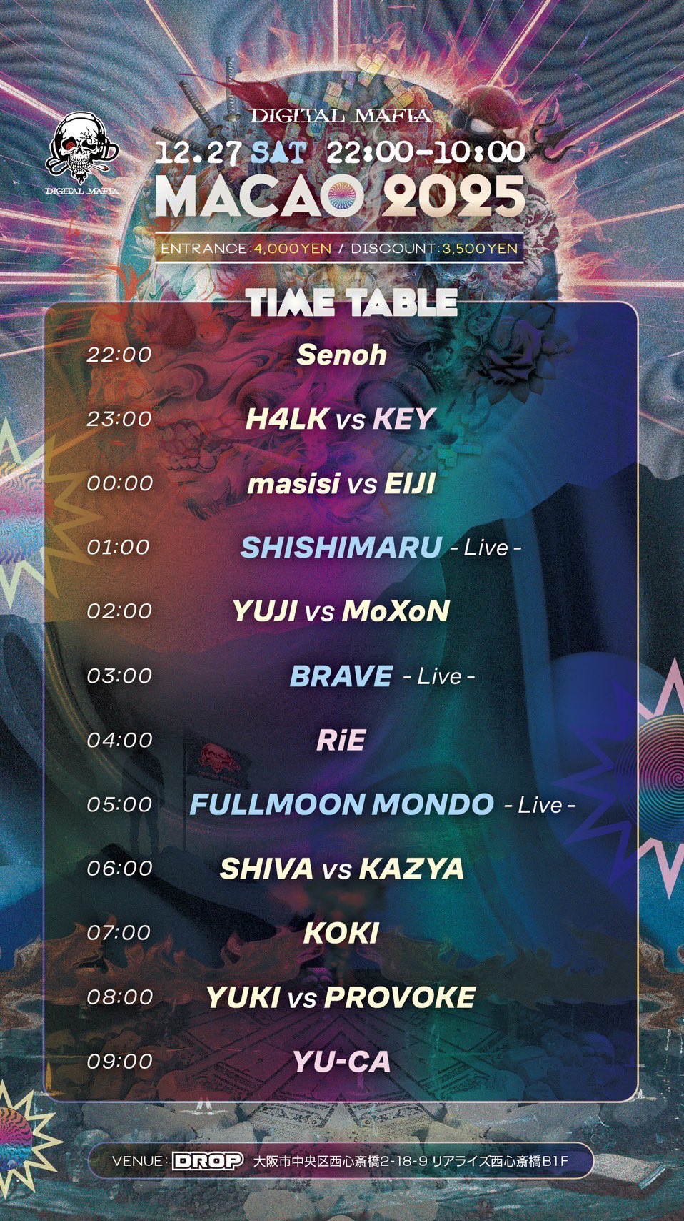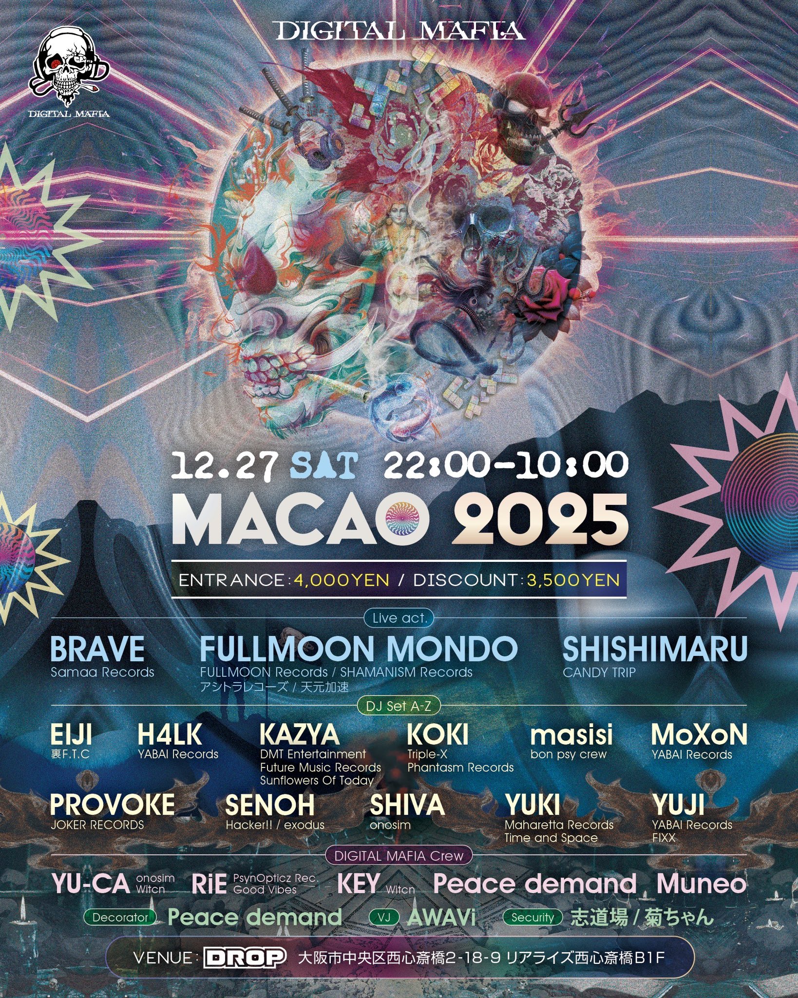 - Live act.BRAVE(Samaa Records) / FULLMOON MONDO(FULLMOON Records/SHAMANISM Records/アシトラレコーズ/天元加速) / SHISHIMARU(CANDY TRIP) [DJ Set A-Z] EIJI(裏F.T.C) / H4LK(YABAI Records)・KAZYA(DMT Entertainment Future Music Records/SunFlowers Of Today) / Future Music Records/SunFlowers Of Today) / KOKI(Triple-X/Phantasm Records) / PROVOKE(JOKER RECORDS) / SENOH(Hacker!!/exodus) / SHIVA(onosim) / YUKI(Maharetta Records/Time and Space) / YUJI(YABAI Records/FIXX) [DIGITAL MAFIA Crew] YU-CA(onosim/Witcn) / RiE(PsynOpticz Rec./Good Vibes) / KEY(Witcn) / Peace demand / Muneo [Decorator] Peace demand [VJ] AWAVi [Security] 志道場 / 菊ちゃん