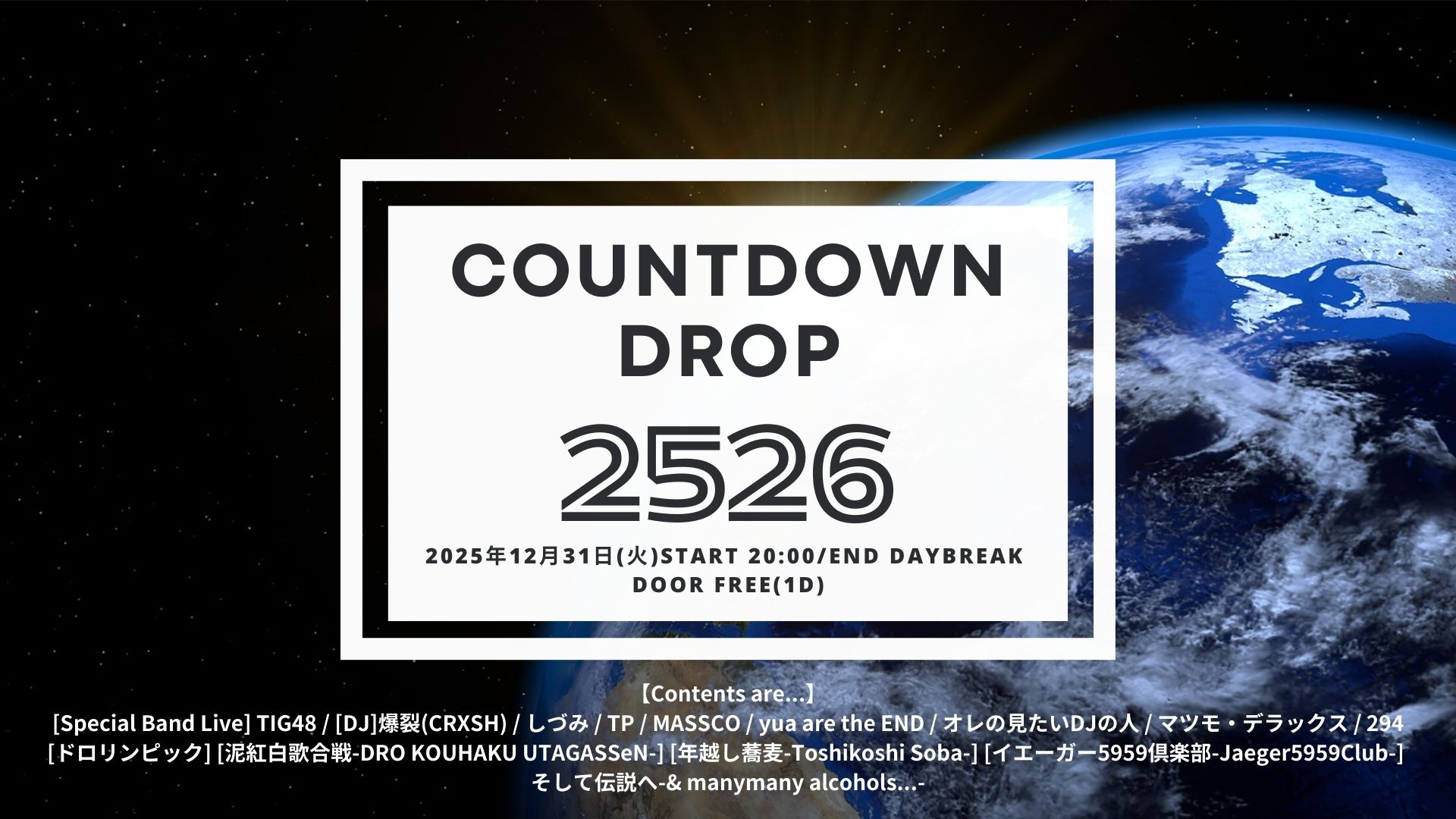 - 【Contents are...】[Special Band Live] TIG48 / [DJ]爆裂(CRXSH) / しづみ / TP / MASSCO / yua are the END / オレの見たいDJの人 / マツモ・デラックス / 294 [ドロリンピック] [泥紅白歌合戦-DRO KOUHAKU UTAGASSeN-] [年越し蕎麦-Toshikoshi Soba-] [イエーガー5959倶楽部-Jaeger5959Club-] そして伝説へ-& manymany alcohols...-