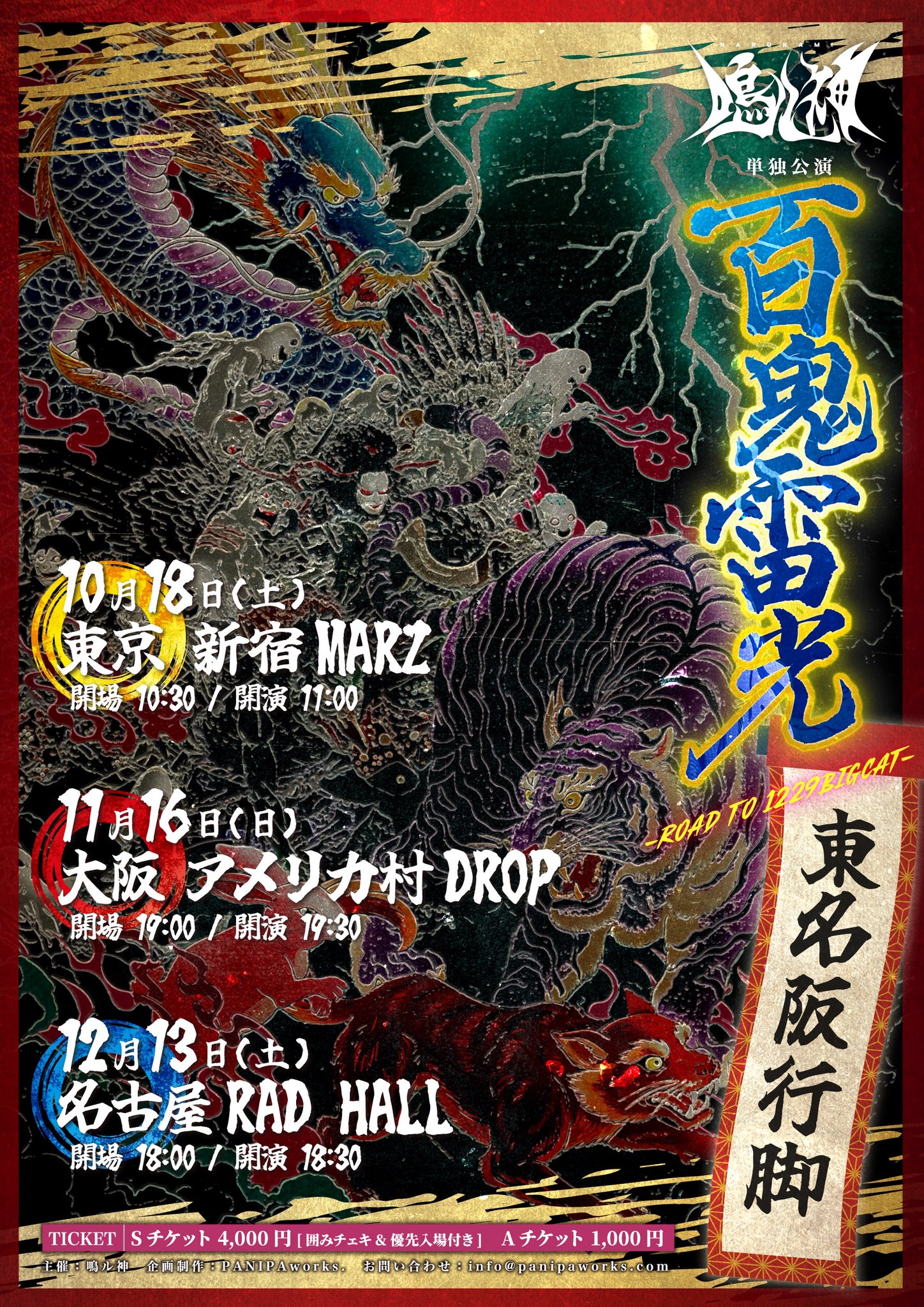 アメリカ村 DROP(ドロップ) スケジュール 2025.11.16(Sun) 百鬼雷光 東名阪行脚 -ROAD TO 1229BIGCAT- [ACT] 鳴ル神 [OPEN/START] 19:00/19:30 [料金] Sチケット:4,000円(囲みチェキ&優先入場付き) / Aチケット:1,000円 / 当日:1,500円 ◾️チケットURL https://t.livepocket.jp/e/narukami_osaka (問)アメリカ村DROP 06-6213-9101