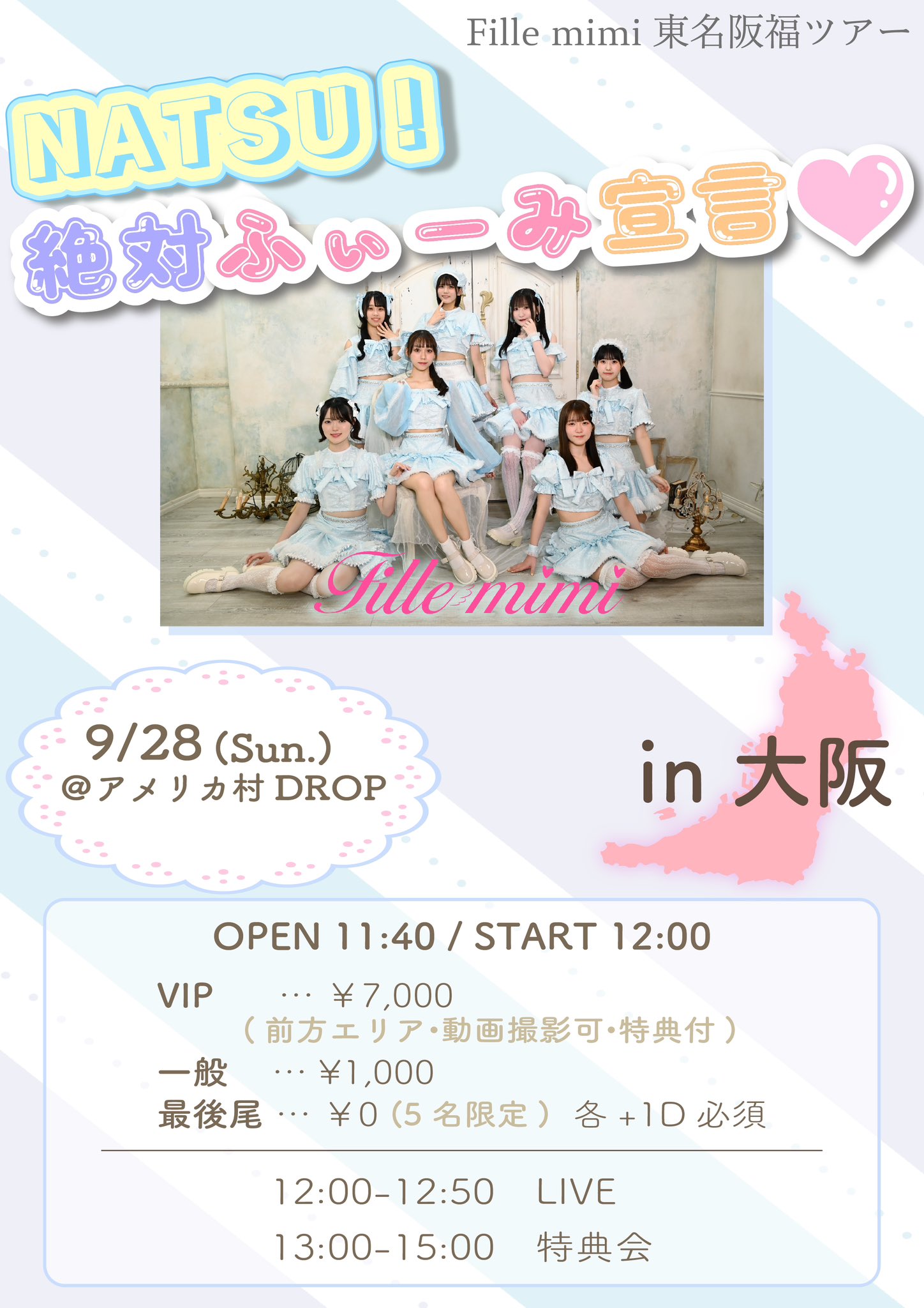 アメリカ村 DROP(ドロップ) スケジュール 2025.9.28(Sun) Fille mimi 東名阪福ツアー NATSU!絶対ふぃーみ宣言♡大阪編 [ACT] Fille mimi [OPEN/START] 11:40/12:00 [料金] VIP7000円 / 一般1000円 / 最後尾0円(5名限定)(全て1D別) ▫️券売スケジュール 販売URL:https://t-dv.com/Fillemimi_0928_Osaka 【告知解禁】9/6(土) 20:00 【一般販売】9/8(月) 20:00〜(先着販売)