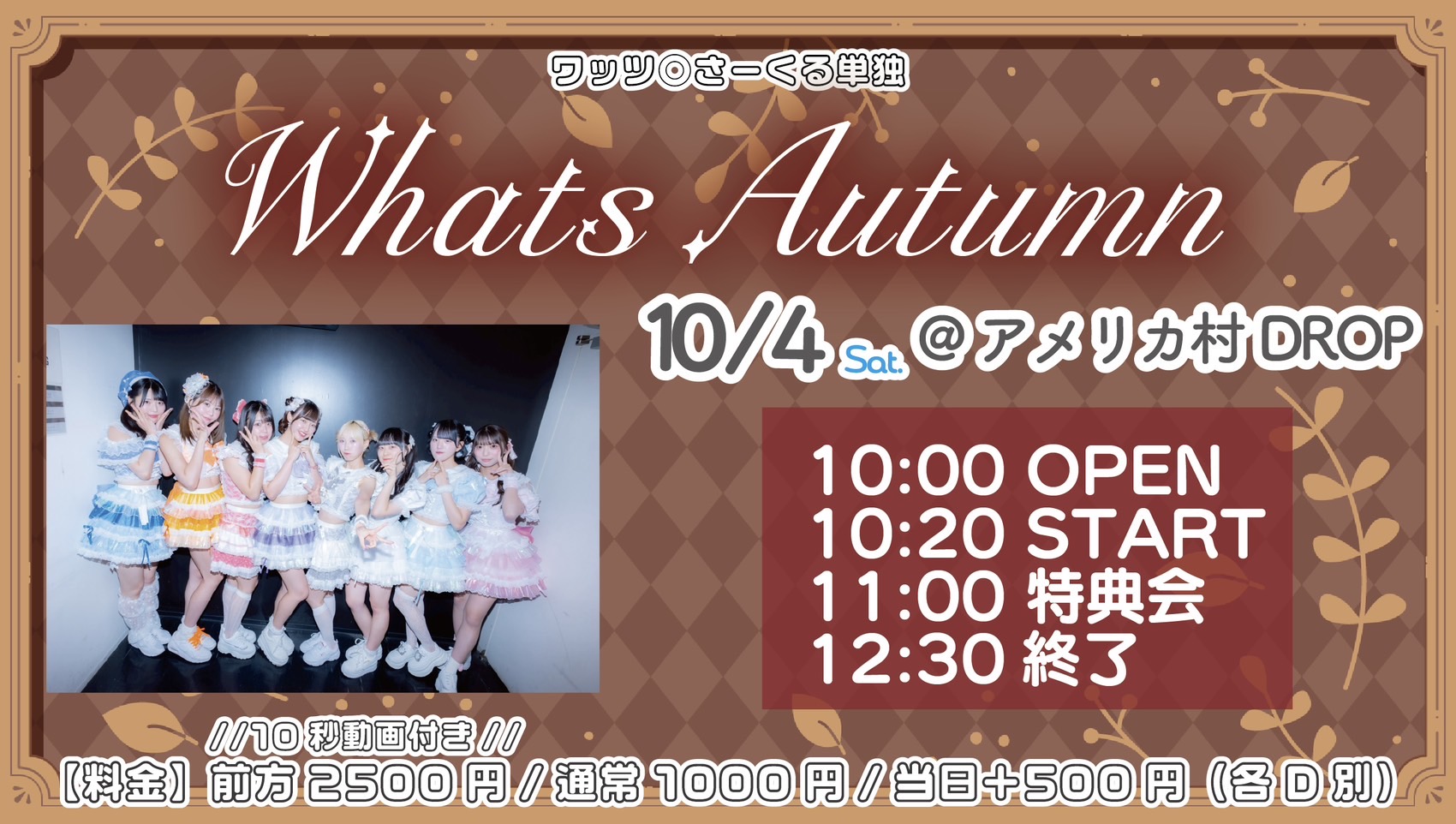 アメリカ村 DROP(ドロップ) スケジュール 2025.10.04(Sat) ワッツ◎さーくる単独公演「What’s Autumn」 [ACT] ワッツ◎さーくる [OPEN/START] 10:00/10:20 [料金] ①前方チケット整理番号順②通常チケット整理番号順③当日券 チケット:https://t.livepocket.jp/e/drop1004