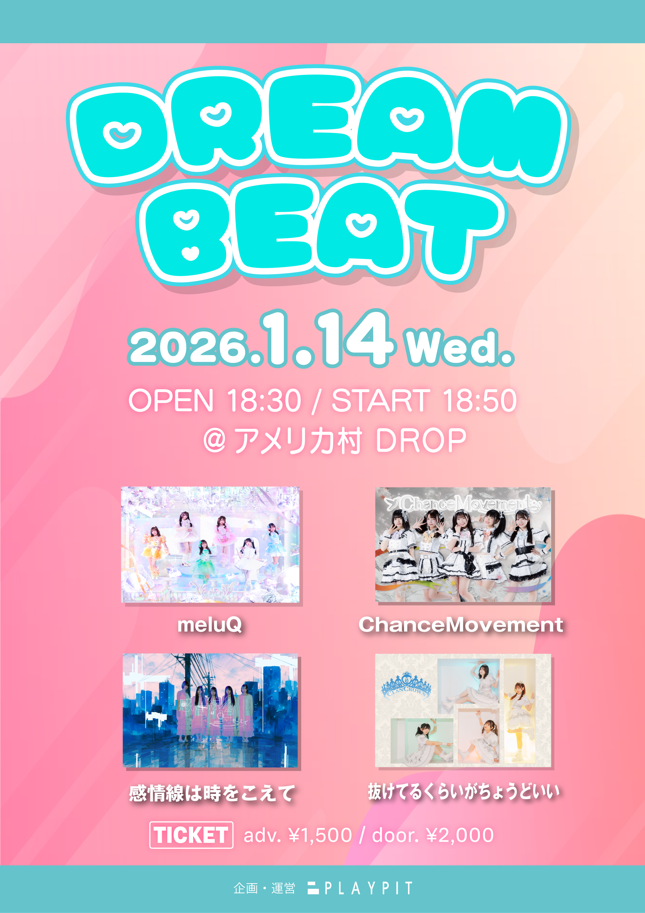 アメリカ村 DROP(ドロップ) スケジュール 2026.1.14(Wed) DREAMBEAT [ACT] meluQ / 抜けてるくらいがちょうどいい / 感情線は時をこえて /ChanceMovement [OPEN/START] 18:30/18:50 [料金] ADV.¥1,500 / DOOR.¥2,000(入場時DRINK代別途700円必要) (問)アメリカ村DROP 06-6213-9101 チケットはこちらから →https://t-dv.com/DBvol2