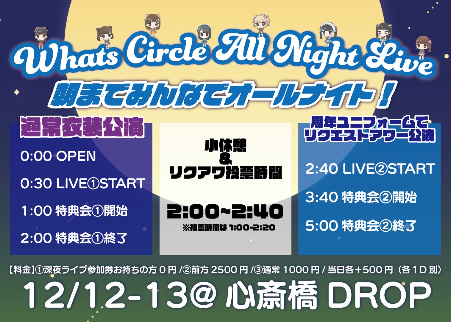 アメリカ村 DROP(ドロップ) スケジュール 2025.12.12(Fri) ワッツ◎さーくる単独公演「Whats Circle All Night Live」 [ACT] ワッツ◎さーくる [OPEN/START] 0:00/0:30 [料金] 深夜LIVE参加券お持ちの方0円/前方2500円/ 一般 1,000円/当日+500円 (各別途1D) 入場順:①深夜LIVE参加券整理番号順②前方チケット整理番号順③通常チケット整理番号順④当日券