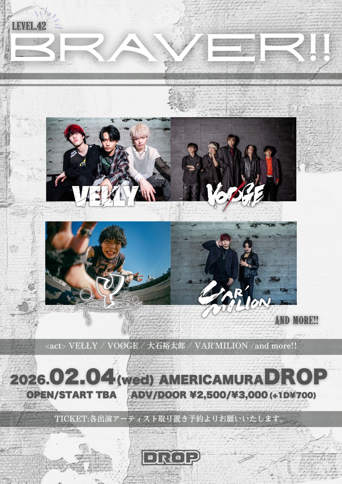 アメリカ村 DROP(ドロップ) スケジュール 2026.2.04(Wed) BRAVER!! LEVEL.42 [ACT] VEŁŁY / VOØGE / 大石裕太郎 / VAR'MILION /and more!! [OPEN/START] TBA/TBA [料金] ADV/DOOR ¥2500/¥3000(入場時別途1D代金¥700-必要) (問)アメリカ村DROP 06-6213-9101