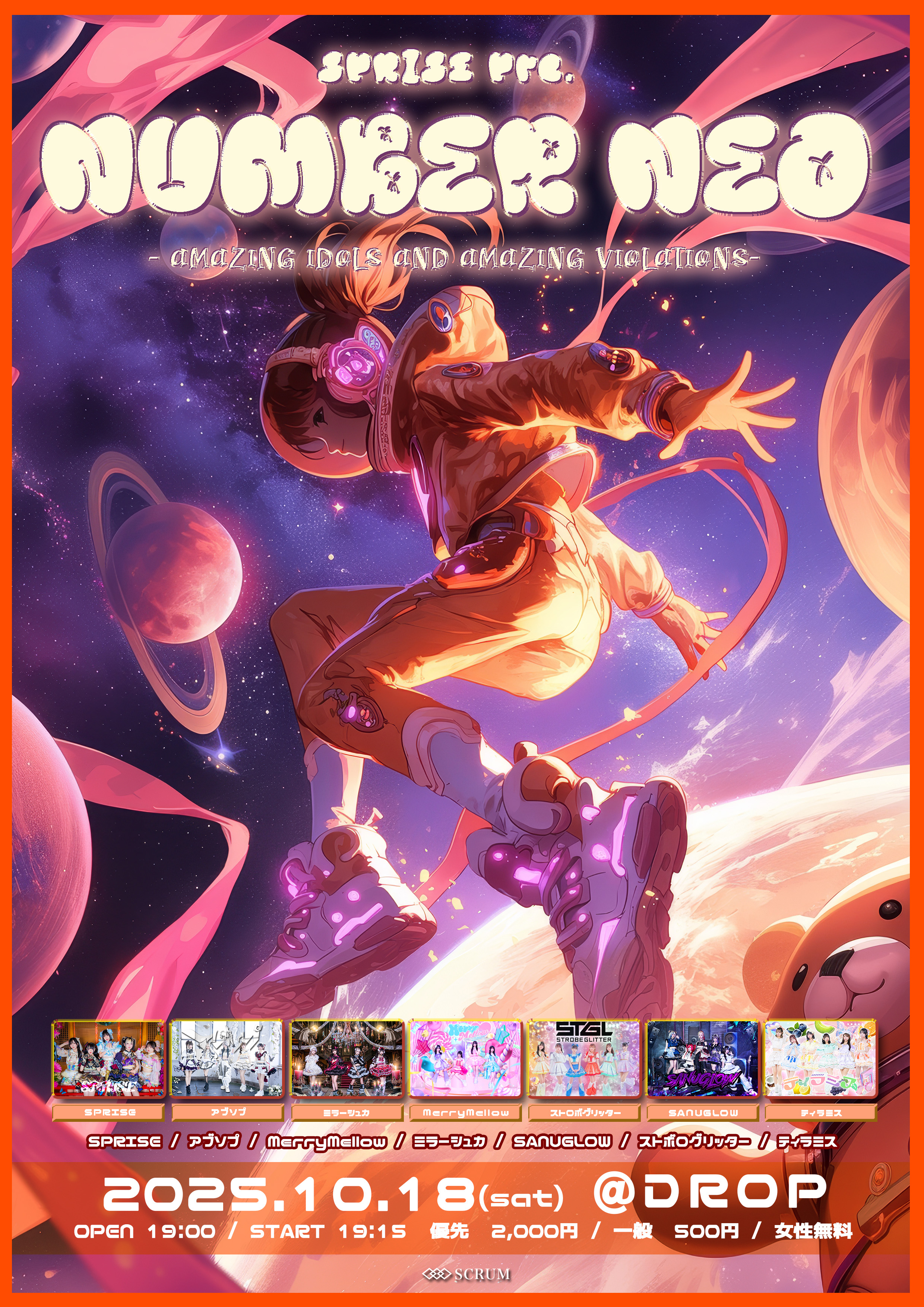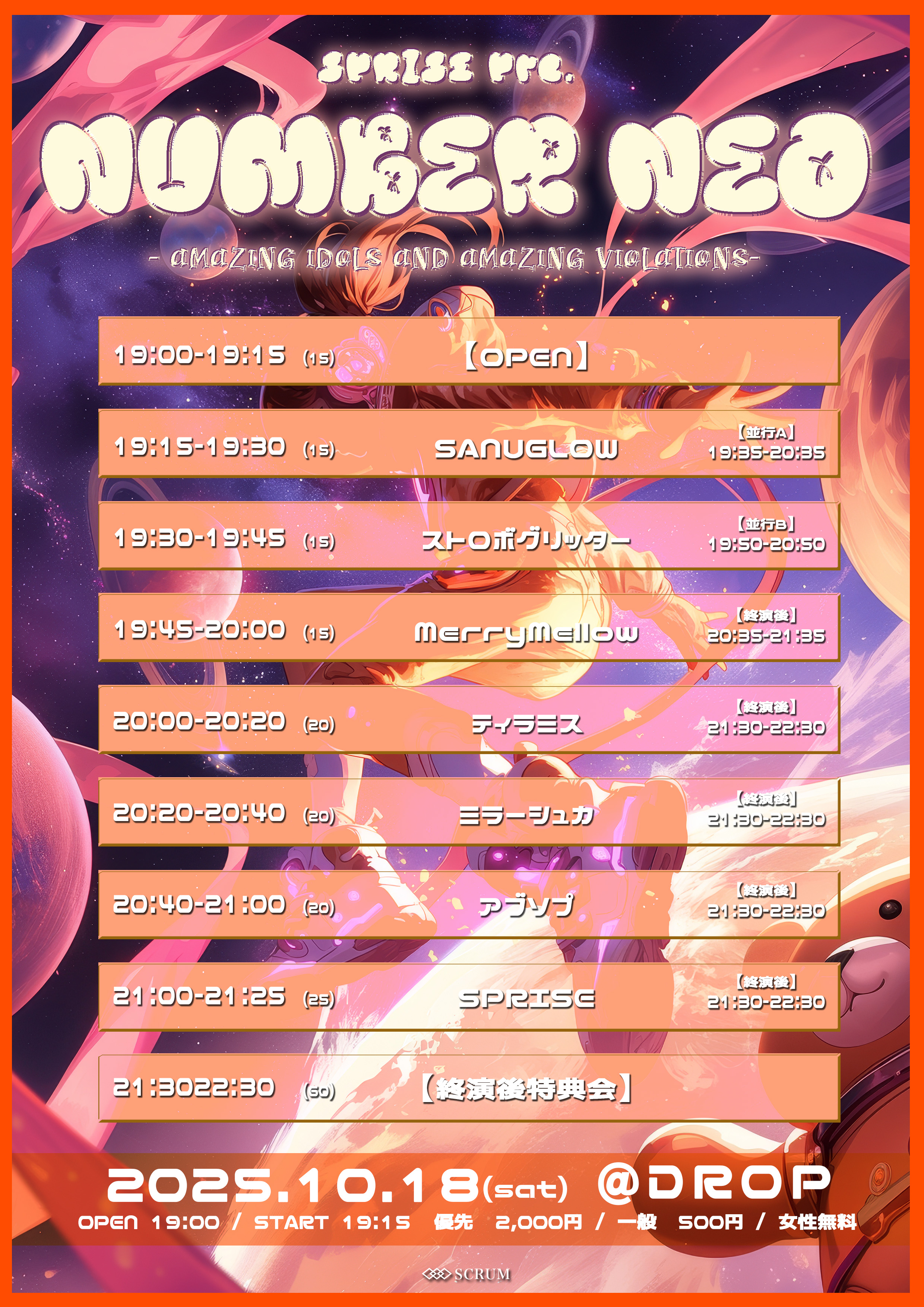 アメリカ村 DROP(ドロップ) スケジュール 2025.10.18(Sat) SPRISE pre.『NUMBER NEO』 [ACT] SPRISE / アブソプ / MerryMellow / ミラーシュカ / SANUGLOW / ストボログリッター / ティラミス [OPEN/START] 19:00/19:15 [料金] 優先 ¥2,000 / 一般 ¥500 / 女性 ¥0 (+1D) 【タイムテーブル】 https://t-dv.com/Tuwszj1pAag6hh →10/09 19:00〜 10/18 19:20